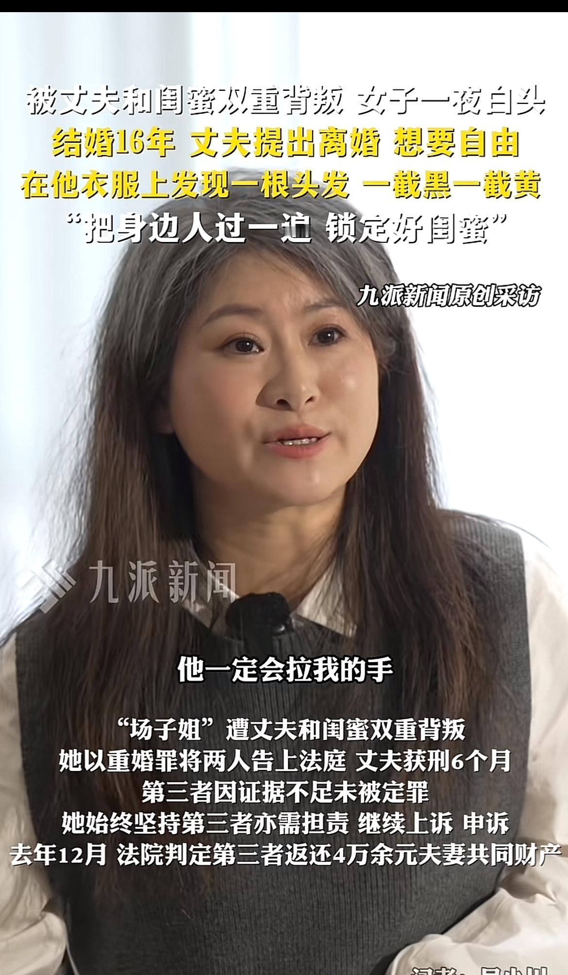 婚姻背叛的故事总是令人唏嘘感慨,“场子姐”的经历便是其中的典型。她和丈夫白手起家创立公司,携手走过近20年,却遭遇丈夫与闺蜜的双重背叛。2021年,她在丈夫车内发现闺蜜的打胎资料,刹那间,她的世界崩塌,甚至“一夜白头”。 原来,她的丈夫在抖音是拥有20多万粉丝的小网红。公司与闺蜜签订合同后,两人便勾搭在了一起。2023年一审判决,丈夫因重婚罪入狱6个月,闺蜜却安然无事。“场子姐”不服判决,坚持申诉。2025年12月29日,二审判决闺蜜返还4万余元。她一路打了13场官司,着实艰辛不易,复仇之路总算有了一丝曙光。