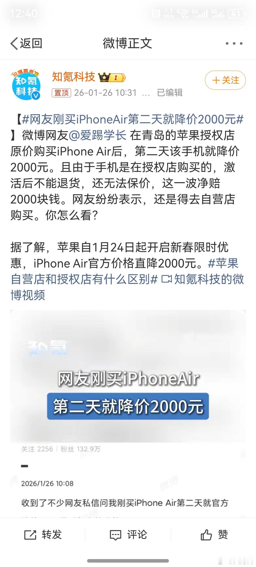 网友刚买iPhoneAir第二天就降价2000元 ,有时候官方的售后服务还不如第三方的,从京东买好歹还有保价服务,官方买的就只能认栽了