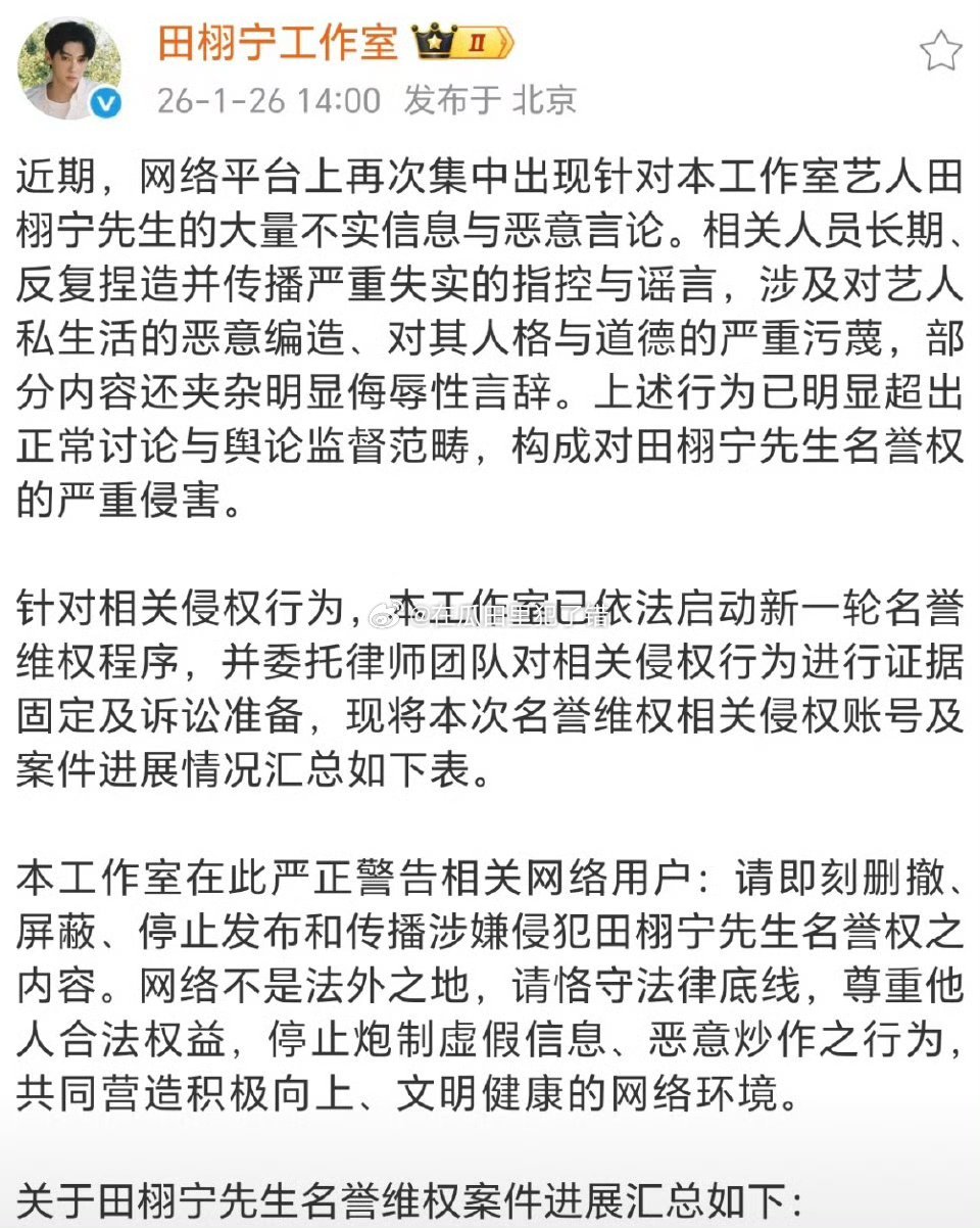 田栩宁工作室发布告嘿声明,接下来是不是梓渝家了?