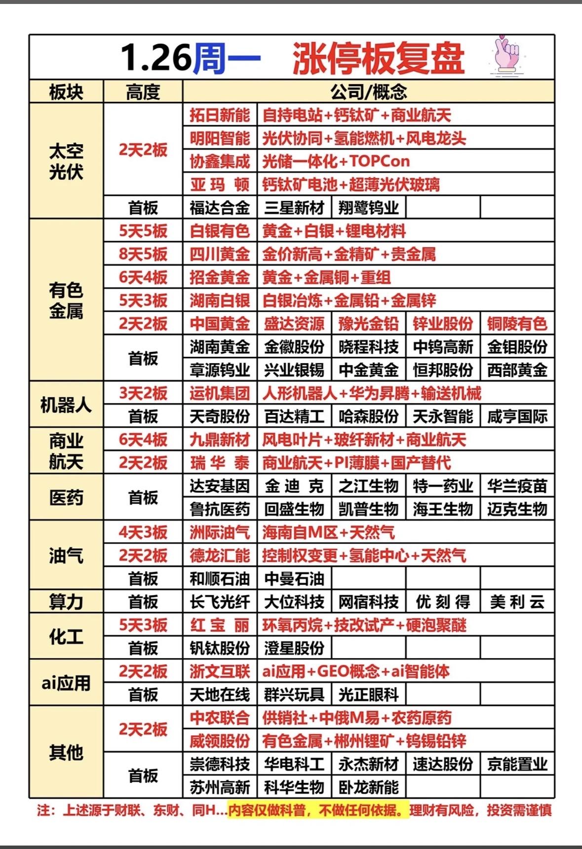 “1.26周一涨停板复盘:板块高度与概念解析”📈📊 光伏钙钛矿与黄金板块领涨,商业航天、医药、机器人概念活跃,新能源与有色强势。投资需谨慎。 "新能源与贵金属板块活跃,光伏钙钛矿、商业航天受捧,黄金白银持续走强,医药机器人异动,投资需谨慎。"