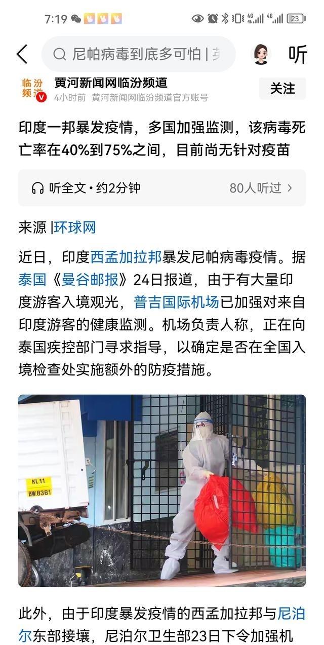 印度发生可怕的疫情,死亡率高达70%这种病毒可怕,传染率高,人和动物可以互相传染,所以我们要重视起来,要严控相关地区人员出入中国,希望我们的政府部门高度负责起来。 最近印度西孟加拉邦爆发的尼帕病毒疫情确实让人捏把汗。这种病毒不是新东西,1998年就在马来西亚出现过,当时造成上百人死亡,主要是养猪户和接触猪的人先中招,后来传到新加坡。病毒的天然宿主是果蝠,这种蝙蝠携带病毒自己不生病,但通过唾液、尿液污染水果、棕榈汁或者猪饲料,就能把病毒带给人。印度那边很多人有喝新鲜棕榈汁的习惯,采集汁液的罐子晚上常被果蝠舔,污染源就这样形成了。人感染后还能传给人,主要靠密切接触,比如医院护理或者家里照顾病人时没做好防护。 这次西孟加拉邦的病例不多,只有几例,但死亡率高得吓人,世卫组织数据里尼帕病毒的病死率通常在40%到75%之间,具体看暴发规模和医疗条件。患者先发烧、头痛,很快出现意识模糊、呼吸困难,甚至脑炎昏迷。潜伏期短的4天,长能到45天,早期症状跟普通感冒差不多,很容易被当成小病拖过去。没有疫苗,也没有特效药,全靠支持治疗,吸氧、降颅压、维持生命体征,能活下来算运气好,活下来的还有可能留神经后遗症。 病毒传播链条是动物到人再到人,这点最麻烦。R0值低,大概0.4到0.5左右,意思是一个病人平均传不到一个人,不像新冠那样指数级扩散,所以一般局限在局部,不会全国大流行。但正因为传播靠长时间近距离接触,一旦进医院或者家庭,就容易在医护和家属间小范围传播。印度人口密度高,医疗资源在一些地方又紧张,防控压力不小。 放到我们这边看,输入风险确实存在。过去一年多,印度来中国的人明显多了,广州、北京、上海这些城市街头印度面孔常见,IT行业、贸易、留学各方面都有。航班直飞的也多,人员流动频繁。尼帕病毒虽然传播力不强,但万一有潜伏期的人入境,到了社区或者医院才发病,后果不好说。尤其现在春运前后,人流量大,任何输入性传染病都得盯紧。 我们不是排外,印度人来中国工作生活正常交流没问题,但公共卫生安全是底线。国家利益摆在前面,边境口岸、机场、海关这些关口该加强监测就得加强。入境健康申报、体温筛查、核酸或者抗体检测,根据风险等级调整措施,这些都是常规操作。疾控部门和海关早就有一套输入性疫情的应急预案,尼帕这种高致死病毒进来,触发红色预警很正常。早发现早隔离,就能把风险掐在最小。 再说回病毒本身,它传染率不算高,但致死率高加上无药可用,就让人特别警惕。人畜共患病的防控难点在于动物源头难切断,果蝠到处飞,栖息地被挤压后更靠近人类居住区。印度城市化快,生态变化大,这种病毒反复在南亚冒头不奇怪。孟加拉国、印度喀拉拉邦都多次暴发过,每次都死很多人。 我们普通人能做的就是关注官方消息,别信网上夸张的传言。别去疫区旅游,不喝生棕榈汁,水果洗干净削皮,接触动物后洗手,这些小事做好就行。国家层面,疾控、海关、移民管理这些部门责任重大,信息共享、通报及时、措施果断,就能把输入风险降到最低。毕竟公共卫生没有国界,但防控责任有国界,以本国人民健康为先,这点没毛病。 尼帕病毒这事提醒大家,全球新发传染病层出不穷,人畜界面管理、国际旅行监测、国内快速响应,这些环节哪个弱了都可能出大问题。我们希望政府部门继续保持高度负责的态度,严防死守,不让这种高致死病毒有可乘之机。安全第一,其他的以后再说。