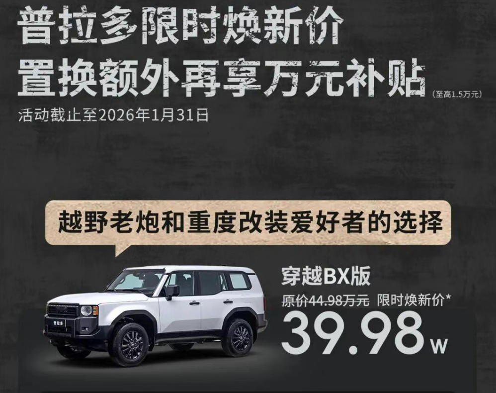 【好消息普拉多39.98万了!坏消息越野能力差点儿!】 普拉多限时焕新价格39.98万元起!具体是指 穿越BX版!好消息是价格终于降到40万内售价区间了。但是缺点是这个配置的普拉多,越野配置也有缩水,陡坡缓降没有了,后桥差速器没有了。当然舒适性配置也缩水了,前后雷达没有,导航没有,LED灯也没有。配置有点儿太低了!【来自懂车帝车友圈】