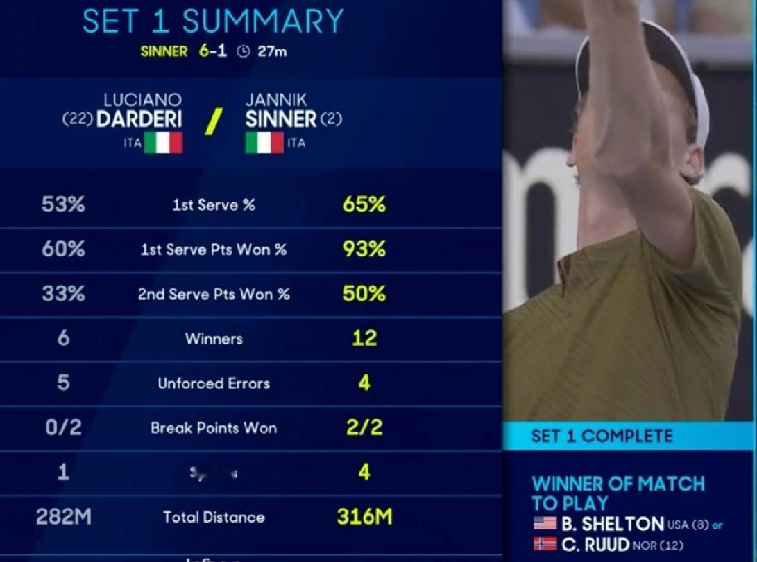 同样都是16强选手,但这差距有些大。辛纳VS达尔德里的2026澳网1/8男单决赛德比之战,感觉两人完全不在一个档次,第一盘6-1,用时27分钟,达尔德里想在辛纳的发球局拿1分都很难,更别想破发点了,以下为首盘两人的技术统计。 ➤一发成功率:达尔德里 53% vs 辛纳 65% ➤一发得分率:达尔德里 60% vs 辛纳 93% ➤二发得分率:达尔德里 33% vs 辛纳 50% ➤制胜分:达尔德里 6 vs 辛纳 12 ➤非受迫性失误:达尔德里 5 vs 辛纳 4 ➤破发点把握:达尔德里 0/2 vs 辛纳 2/2 ➤冲刺次数:达尔德里 1 vs 辛纳 4 ➤总跑动距离:达尔德里 282米 vs 辛纳 316米