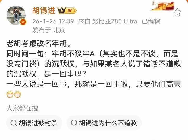 老胡又调皮了!很多时候我并不赞同老胡的车轱辘试评论,但是并不妨碍我欣赏老胡的幽默和犟劲。在社媒平台不少网友对老胡是又爱又恨,边看边骂,边骂边看。 完了又好奇点开他的主页想看看老胡今天又说了啥?毕竟论追新闻热点老胡是公认的鼻子比狗还灵,这点不得不佩服他。 但是,问题在于一天不看老胡就觉得难受,可是看完老胡难受一天,如何是好?🤣🤣🤣 你看看,老胡昨天被架上热搜,评论区乱成一锅粥,本以为会破大防,没想到老胡昨天先提前4小时发一篇关于牢A的文章,然后4小时后再发一篇引用4小时前发的那篇来向大伙证明,我有讨论牢A呀,怎么没有,这就是证据! 今天更是满血复活,“调戏”网友:我“老胡”考虑改名“牢胡”了,仿佛在说诸君还能黑我几多? 说老胡犟,就是先前董大姐在内部会议上谈到格力拒绝招聘留学生的问题,董大姐当时说留学生当中有间谍,怕因此造成技术泄密所以拒招留学生。老胡认为董大姐说的不对,得道歉!但是董大姐保持沉默拒绝回应。 现在网友怼老胡为何不回应牢A相关话题,老胡说我有权保持沉默。网友说那为什么董大姐不可以保持沉默?老胡现在又说,一码归一码,不是同一回事!真是能打败今天老胡的,只有明天的老胡啊!哈哈哈
