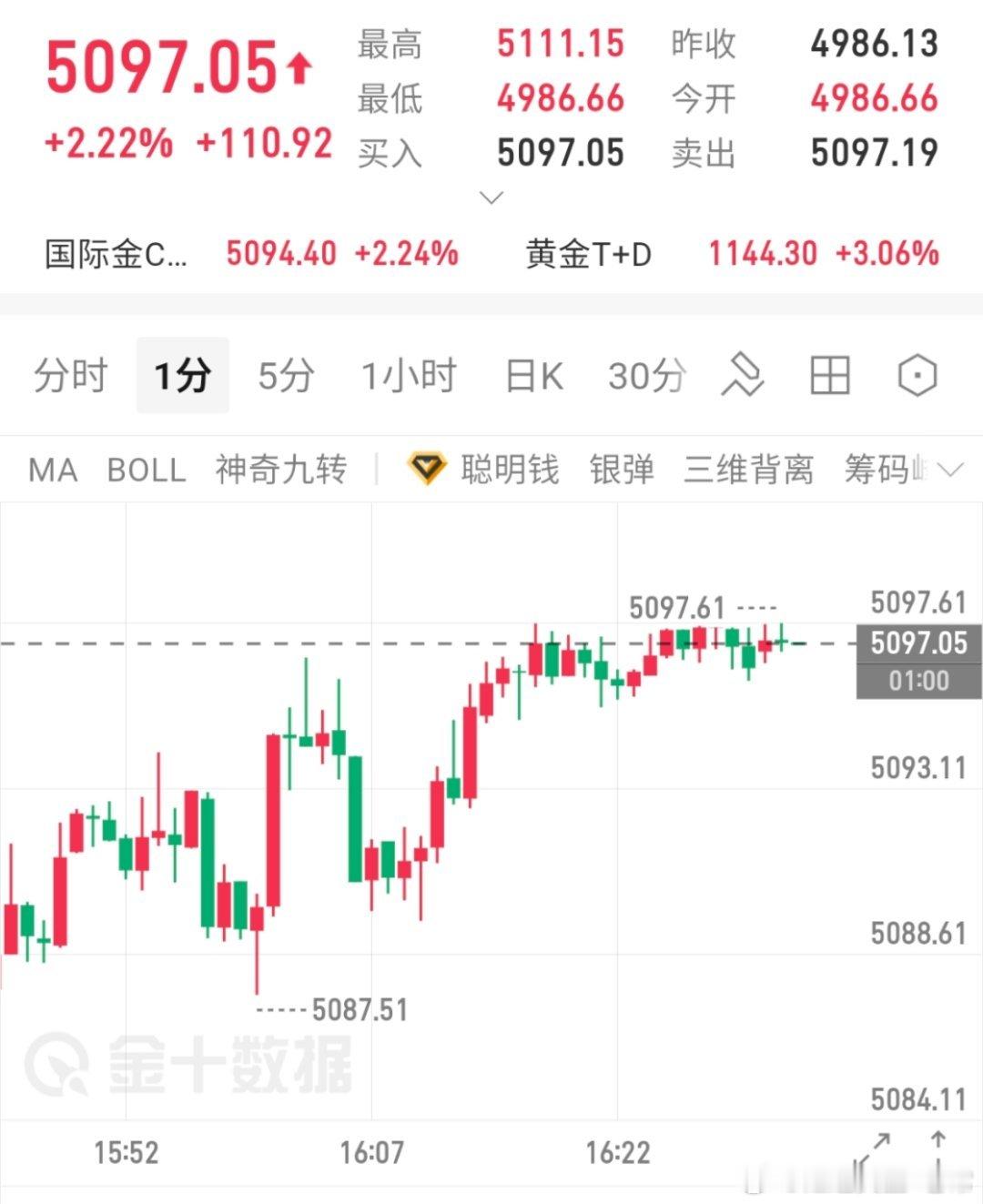 手握5077多单上涨至目前5097已斩获二百点目前行情持续高位震荡,关注重回5100上方,今天暂不考虑空,5077的多单做好护利稳坐钓鱼台,就看5130!黄金金价