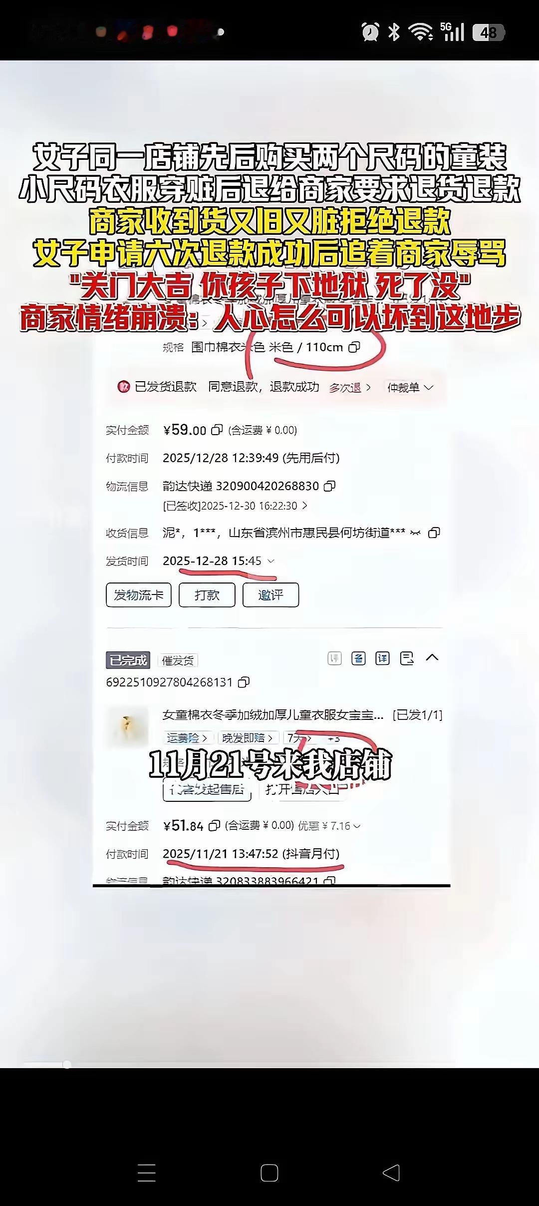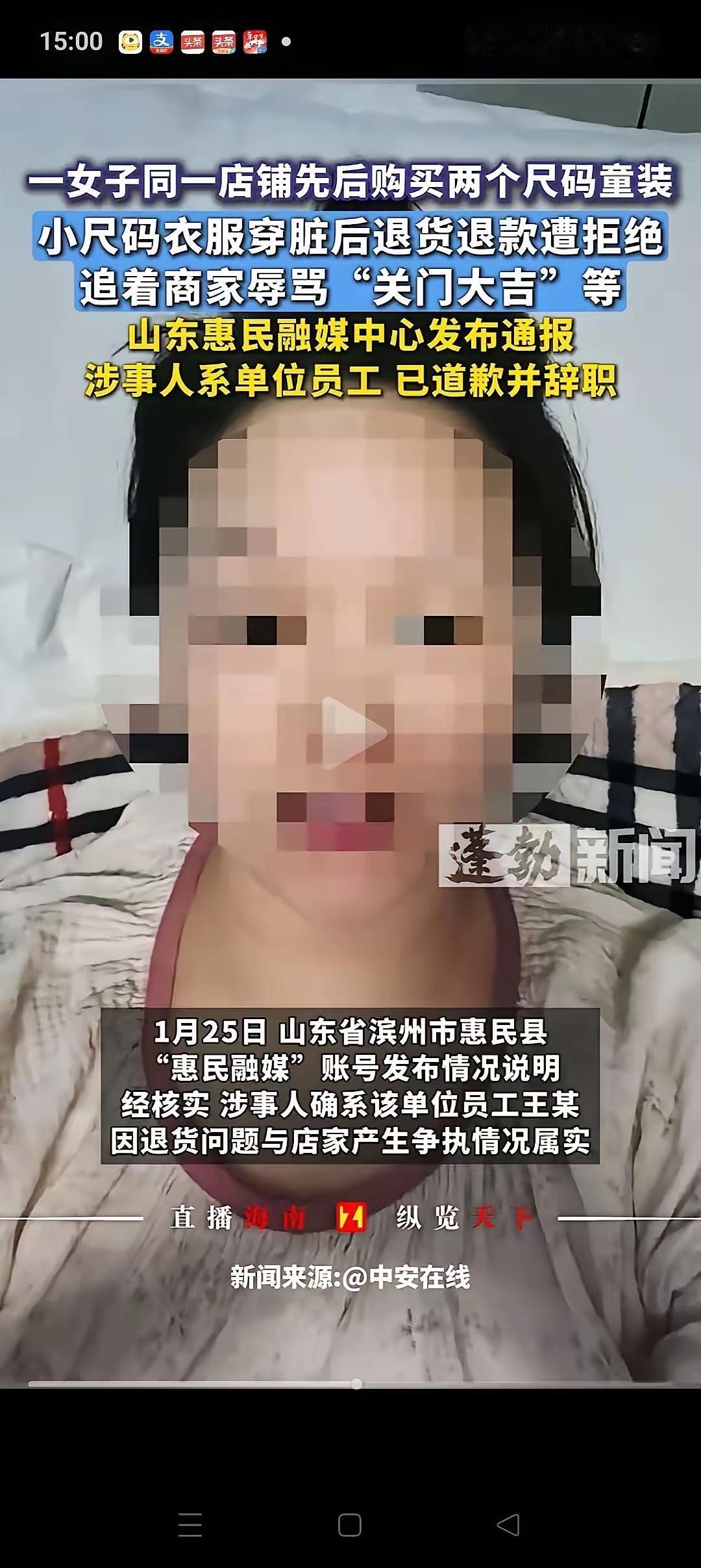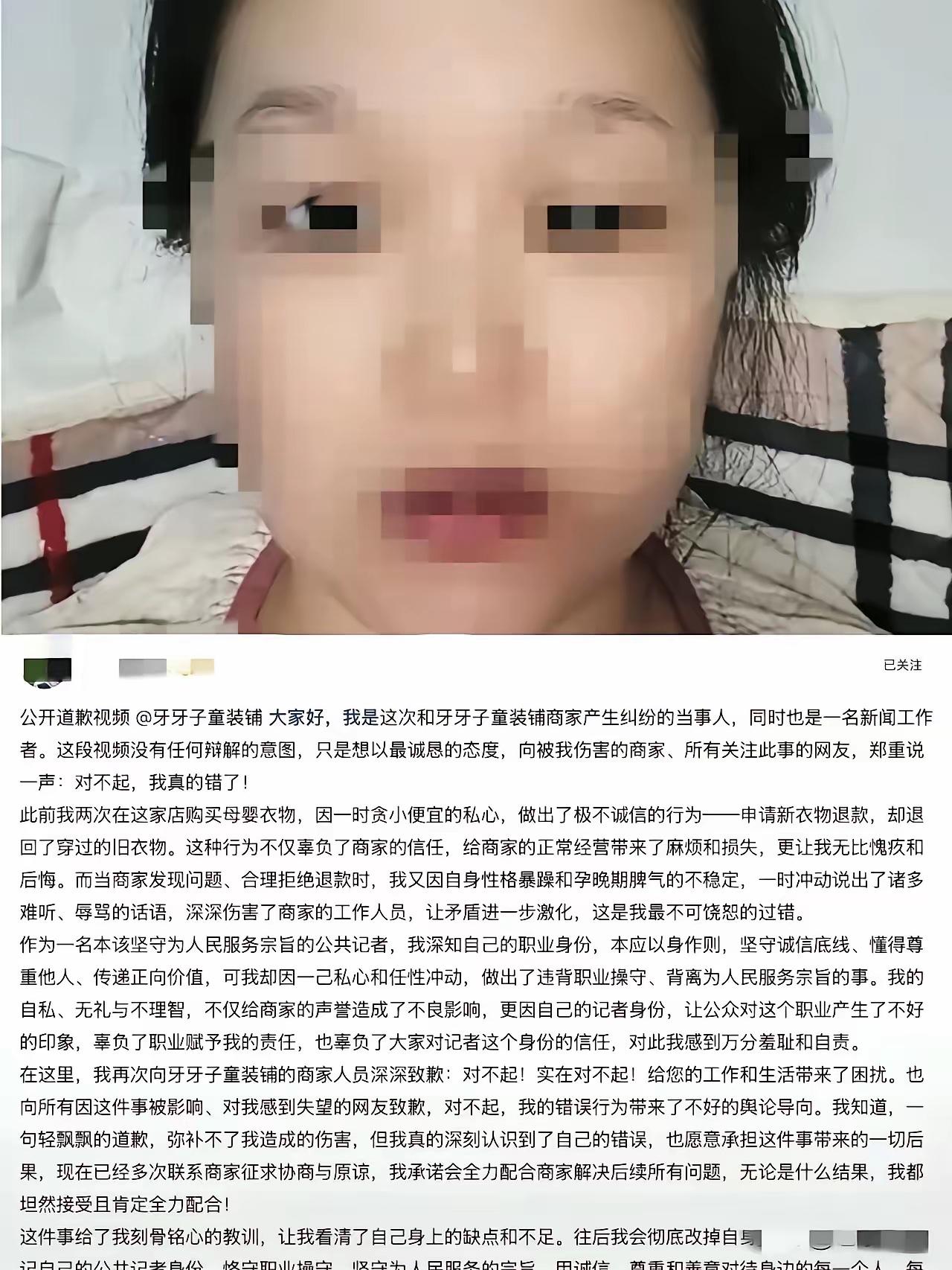 山东惠民县的王女士肠子都悔青了!为了贪便宜,把自己小孩穿过的旧衣服当成新衣服退货,被商家发现后,还连续辱骂6天,直到退款成功。 经过调查,原来王女士还是一名记者,在山东惠民县融媒体中心工作。不过事情曝光后,她已经主动申请离职,并公开道歉!看她写的道歉信,其实也还是在替自己找理由。说自己处于孕晚期,本身脾气也不是太好,才会做了出格的事,说了难听的话。 因为一件衣服失去工作,这事看起来是偶然事件,实际上验证了“德不配位,必受其累”这句话。 事情的来龙去脉比想象中更让人唏嘘。王女士给孩子买的是一件百元左右的婴幼儿外套,穿了半个多月后,发现衣服有点起球,便动了“以旧充新”退货的念头。她特意把衣服上的污渍擦干净,熨烫平整后寄回商家,还在退货申请里写着“收到即瑕疵,未穿未洗”。商家收到退货后,一眼就看出了猫腻——衣服领口有明显的磨损痕迹,袖口还残留着洗不掉的奶渍,完全不是全新未穿的状态。 商家本着沟通解决的态度,拍了衣服的细节照片发给王女士,说明情况后拒绝了退货申请。可谁也没想到,这一拒绝竟点燃了王女士的怒火。她先是在购物平台上连发多条消息辱骂商家,用词粗俗不堪,从“奸商”“黑店”骂到人身攻击,甚至威胁要“曝光你们的黑心生意”。商家多次解释沟通,可王女士根本不听,反而变本加厉,每天定时定点发送辱骂信息,整整持续了6天。 更讽刺的是,王女士在辱骂时还特意强调自己“是记者,有的是办法让你们倒闭”。这句话彻底激怒了商家,也让事件的性质发生了转变——原本只是一起普通的退货纠纷,因为她的职业身份和嚣张态度,变得格外引人关注。商家不堪其扰,无奈之下将聊天记录、衣服新旧对比照片等证据整理好,发布到了网上,希望能得到公正的评判。 帖子一经发出,瞬间引发轩然大波。网友们看完后纷纷怒斥王女士“丢了记者的脸”:“记者本该是客观公正、维护正义的职业,怎么能为了百块钱耍无赖,还仗着身份威胁商家?”“孕晚期不是作恶的借口,脾气不好更不能成为辱骂他人的理由,这根本就是品德问题!”随着舆论发酵,王女士所在的惠民县融媒体中心也很快注意到了此事。作为官方媒体机构,融媒体中心对工作人员的职业操守有着严格要求,王女士的行为不仅违背了职业道德,还损害了单位的公众形象,即便她主动申请离职,也难逃舆论的谴责。 再看王女士后来发布的道歉信,字里行间没有多少真诚的反思,反而处处透着辩解。她提到“孕晚期激素波动大”“经济压力大”,却对自己“以旧充新”的欺诈行为轻描淡写,对连续6天辱骂商家的事实也只是一笔带过。这种缺乏诚意的道歉,不仅没得到网友的谅解,反而让更多人反感——犯错不可怕,可怕的是不承认错误,还把所有责任都推给客观因素。 其实仔细想想,王女士的行为绝非偶然。作为一名记者,她本该比普通人更清楚诚信的重要性,更明白尊重他人是基本的做人准则,可她却为了一点蝇头小利,抛弃了职业操守和个人品德。这背后反映的,是一种“特权思维”和“精致利己主义”:觉得自己有记者身份加持,就能为所欲为;觉得只要能达到目的,耍点小聪明、说几句脏话不算什么。可她忘了,职业身份是用来承担责任、服务公众的,不是用来仗势欺人、谋取私利的。 更让人深思的是,这件事也给所有职场人敲响了警钟:职业身份从来不是个人品德的“遮羞布”,反而会放大品德上的缺陷。一个人的能力再强,职位再高,若没有与之匹配的品德,迟早会栽跟头。王女士失去的不仅仅是一份稳定的工作,更是自己的职业声誉和他人的信任——以后再想从事相关行业,恐怕很难再获得认可。而那个被辱骂的商家,虽然受了委屈,却因为坚守原则、保留证据,赢得了网友的支持和尊重,生意反而比以前更好了。 这世上所有的捷径,其实都藏着陷阱;所有的侥幸,最终都会付出代价。百块钱的衣服,看似是小利,却照出了一个人的人品底线。王女士的经历告诉我们:品德是立身之本,无论身处何种岗位,无论面对多大诱惑,都要守住诚信的底线、尊重的底线、善良的底线。否则,再光鲜的身份,再美好的前途,都会毁在自己的一念之差里。 各位读者你们怎么看?欢迎在评论区讨论。