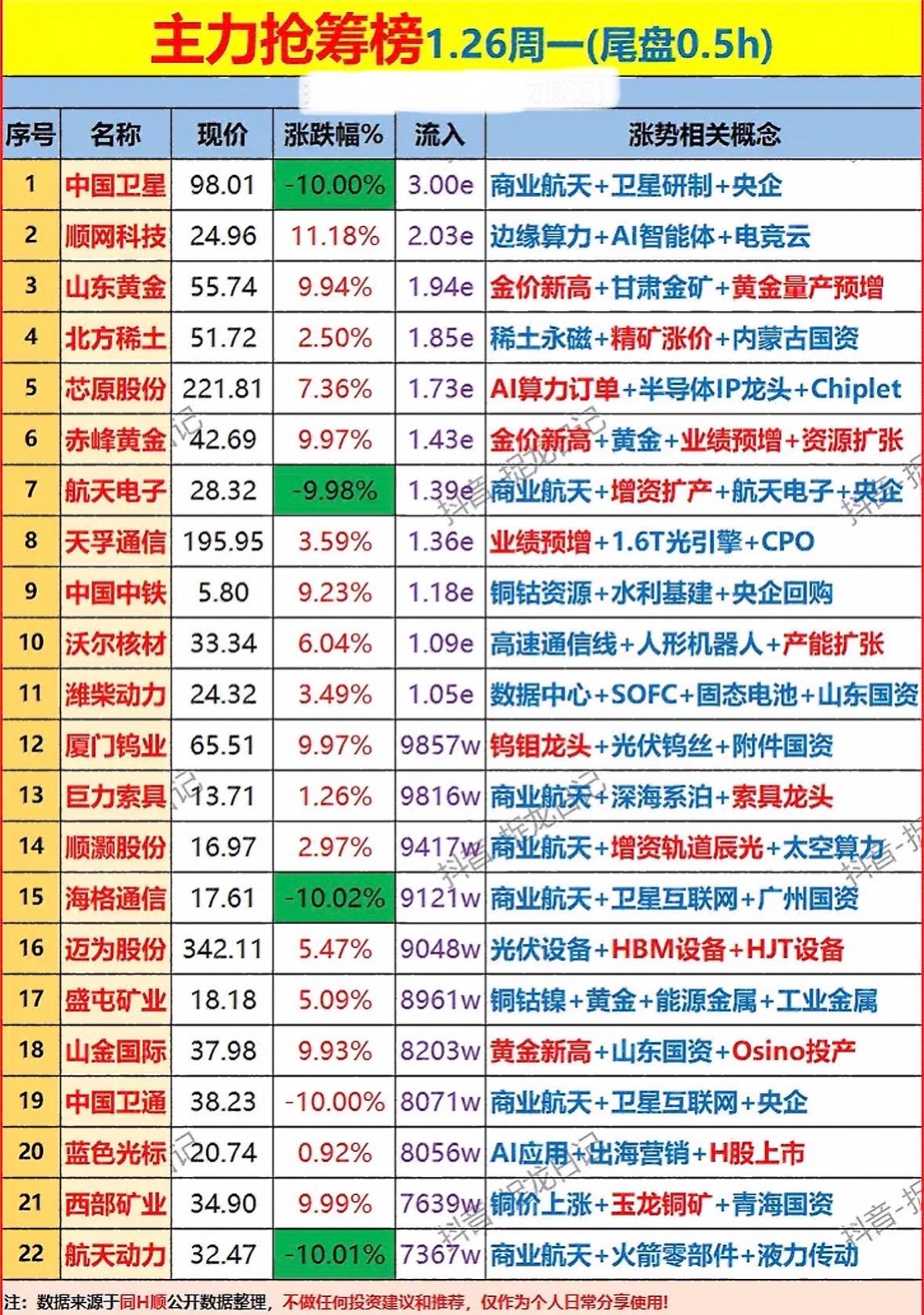 1月26日主力抢筹尾盘30分钟抢筹榜揭晓! 📈📈📈 强势股强势入榜,快来看看哪些股票涨势如虹!🔥🔥🔥 主力抢筹榜:商业航天、黄金、稀土、AI算力等板块受追捧,顺网科技、山东黄金等个股表现亮眼,资金流入明显。