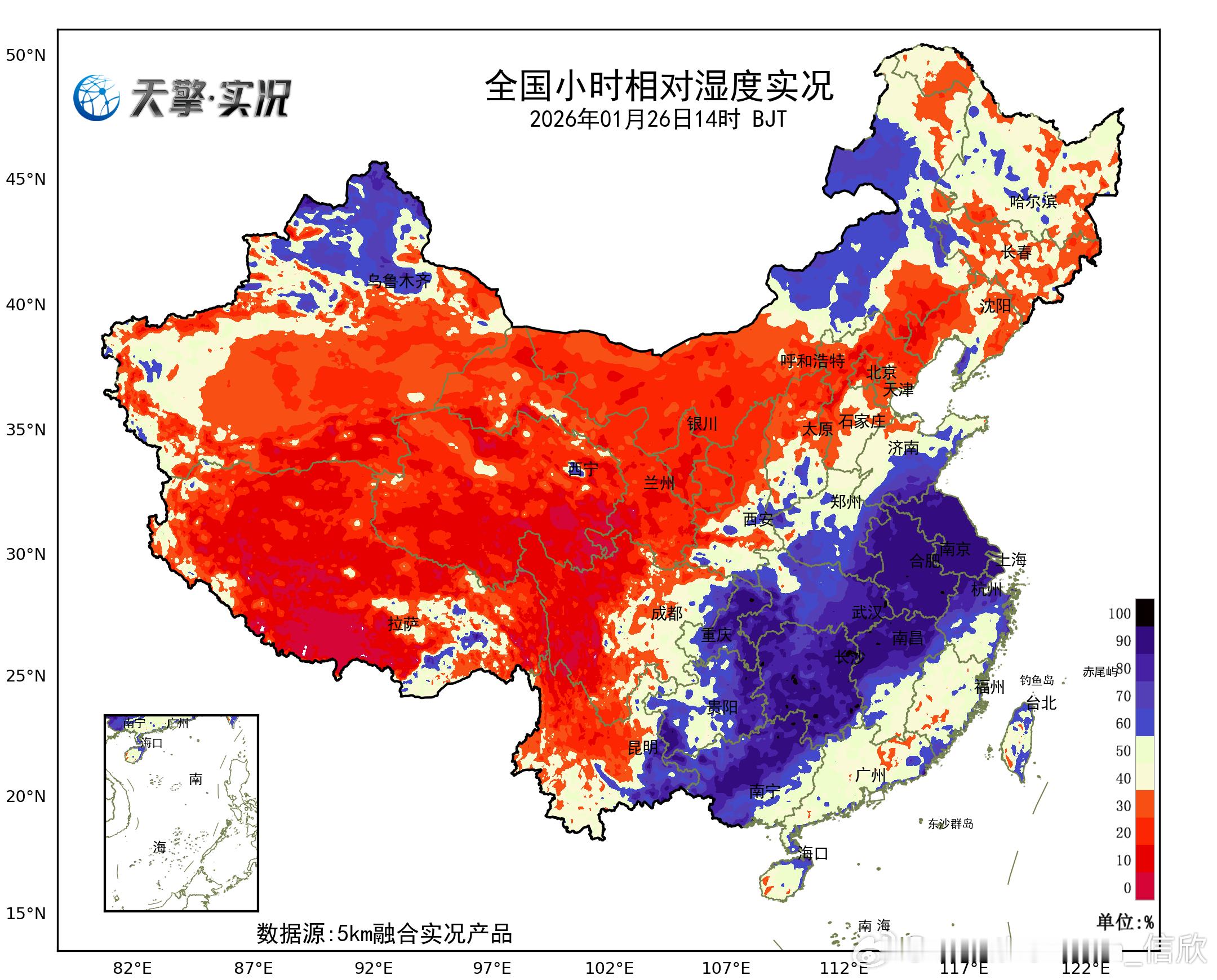 【干燥和降水】今天下午,青藏高原到西北地区东部和华北部分地区,空气干燥。广西湖南湖北江西安徽江苏,湿度大,对应有降水。今天下午到明天中午,降水会缓慢南压。