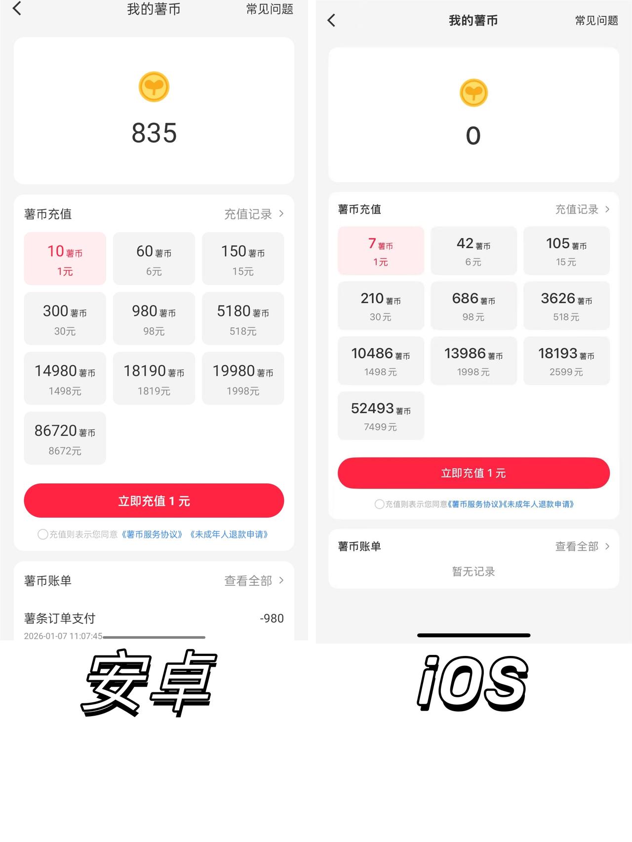 天塌了,这就是传说中的苹果税吗? 去小🍠看了一下薯币充值 安卓手机跟苹果手机区别也太大了😭 😓同样1块钱,差了3个薯币 直观的让大家感受到了苹果税,直接低人一等......