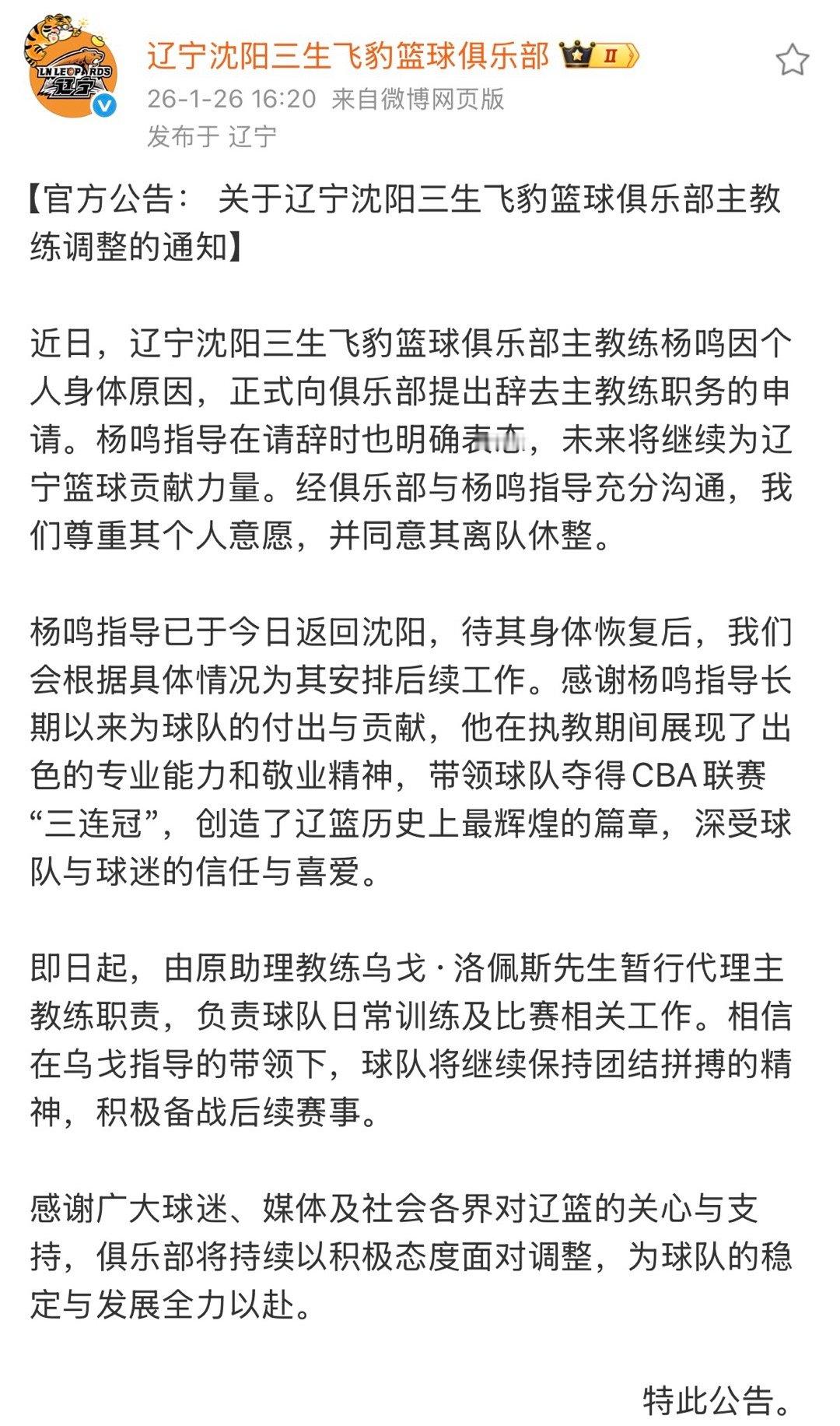 俱乐部回应杨鸣离职杨鸣因身体原因请辞杨鸣卸任辽篮主帅感谢杨鸣指导,祝福杨鸣指导。你太累了,也该歇歇了