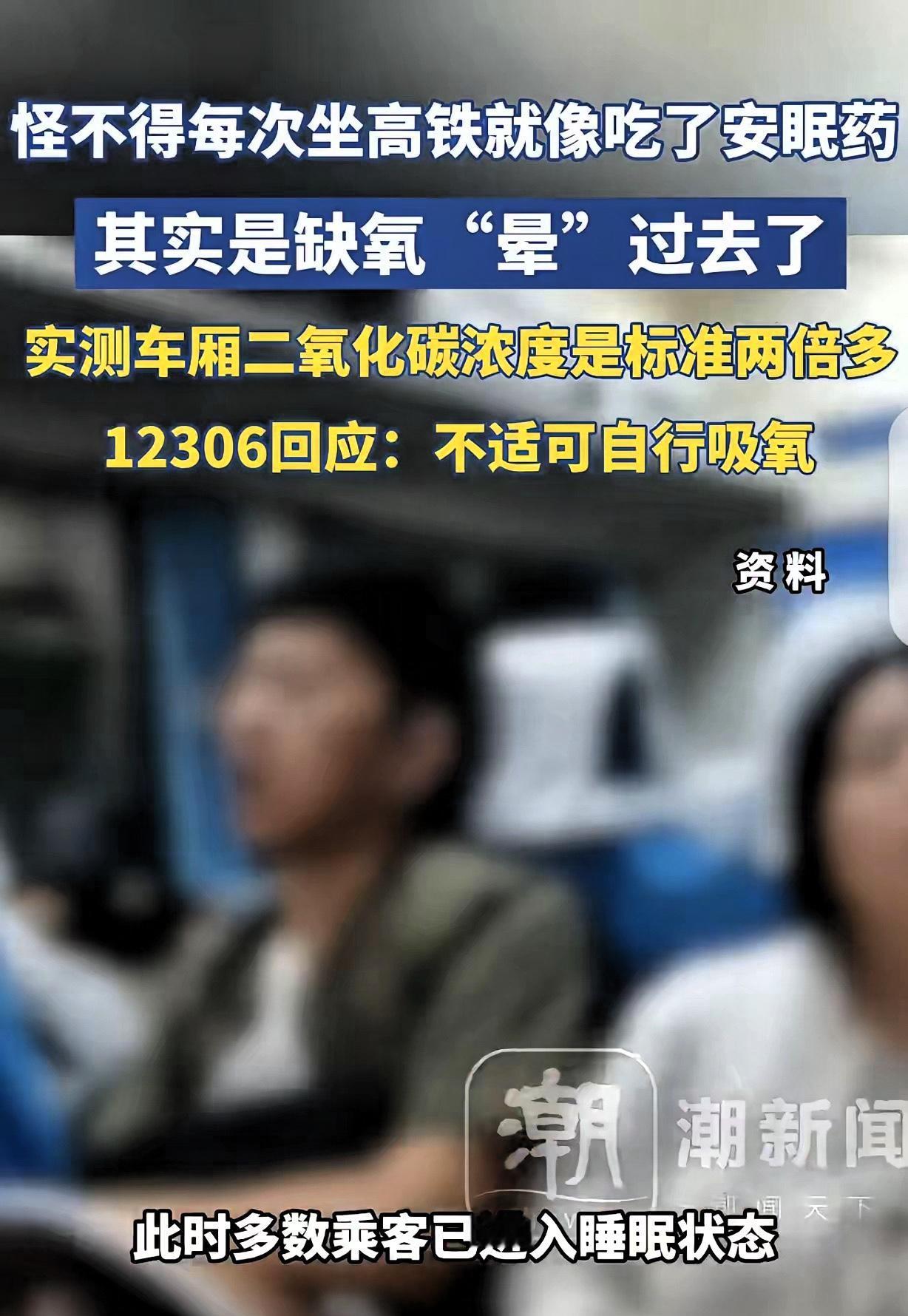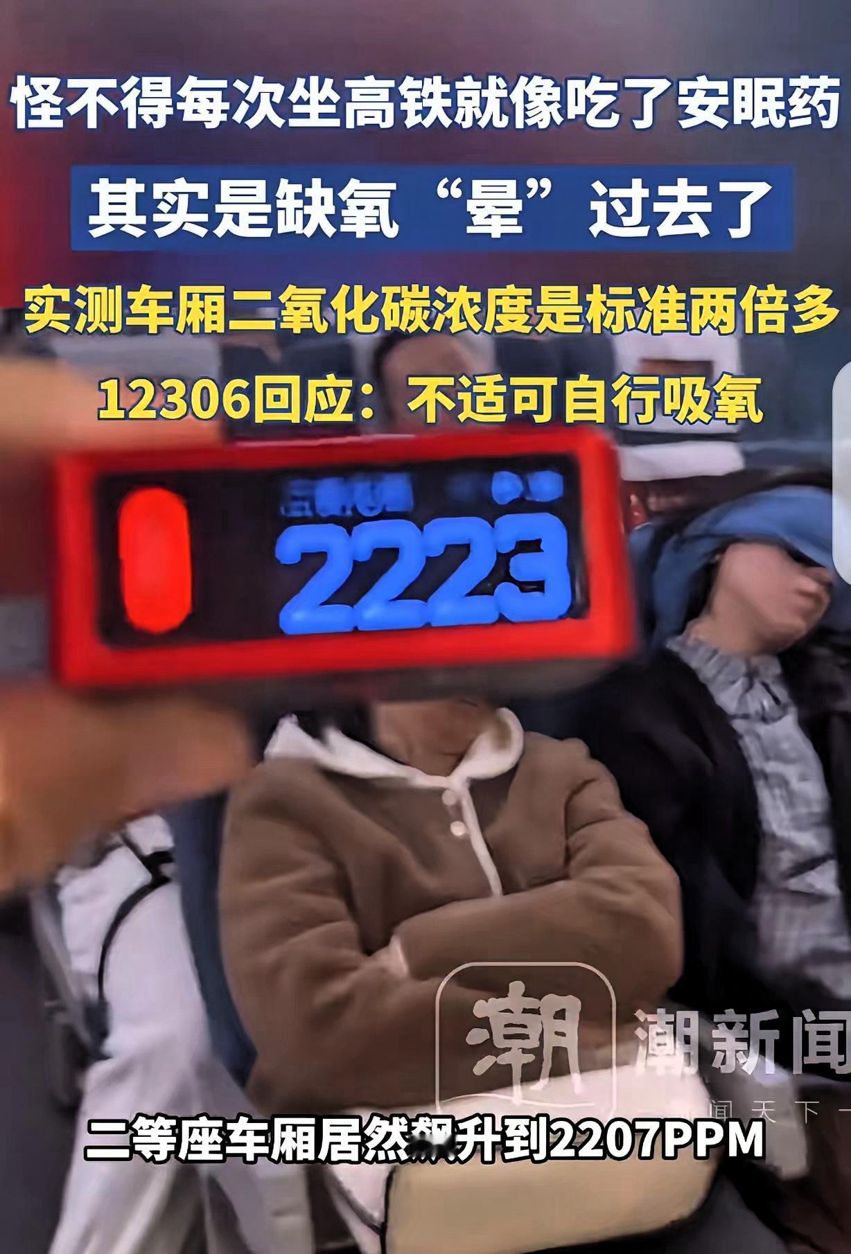“万万没想到!”一男子每次坐高铁就像吃了“安眠药”,一上车就昏昏欲睡,他长了个心眼,出差时带着空气检测仪上了高铁,竟检测出车厢二氧化碳浓度2207ppm,超国标2倍多,他这才知道自己不是犯困,是缺氧“晕”过去了,12306回应:觉得不舒服可以自行吸氧。 这位大哥姓余,本身就是做空气检测相关工作的,经常出差坐高铁,却总被同一个问题困扰。 每次上高铁前明明精神头十足,想着趁旅途赶赶工作,可一落座没半小时,眼皮就沉得像灌了铅,脑袋发懵,不知不觉就睡过去了,到站下车才迷迷糊糊醒过来,工作压根没发推进。 他一开始还以为是自己太累,或者高铁晃动太催眠,直到有次和同事一起出差,发现同事也在车厢里昏昏大睡,才觉得不对劲,决定带着专业检测仪一探究竟。 他刚上车时测了下,车厢里二氧化碳浓度才880ppm左右,还算正常。 可随着乘客陆续入座,车厢坐满后,数值就开始蹭蹭往上涨,没过多久就突破了1500ppm,等高铁行驶一段时间后,直接飙到了2207ppm。 这时候再看车厢里的景象,大半乘客都低着头打瞌睡,有的靠在椅背上睡得正香,和余大哥平时的状态一模一样。 余大哥说,国外有研究显示,高浓度二氧化碳会抑制大脑中枢,难怪大家一坐高铁就犯困,根本不是累的,是被“闷”得缺氧了。 后来有人查了相关标准,民用建筑的二氧化碳限值是1000ppm,可铁路方面说列车执行的是另一套标准,限值是2500ppm,没超标。 但网友们可不买账,毕竟坐高铁是来出行的,不是来“缺氧睡觉”的,尤其是需要办公的乘客,根本没法集中注意力。 12306那句“自行吸氧”的回应,更是让大家觉得离谱,总不能每次坐高铁都随身带个氧气瓶吧? 与其让乘客自行解决,不如多关注下实际体验,比如优化通风系统,在客流高峰时多调节换气频率,别让“坐高铁必犯困”变成默认现象,毕竟舒适的乘车环境,才是大家真正需要的。