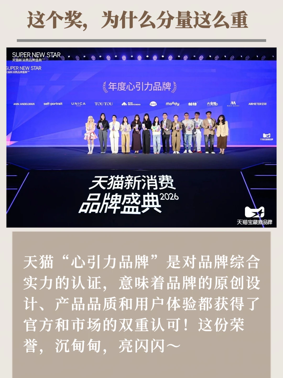 天猫“心引力品牌”是对品牌综合实力的认证,意味着品牌的原创设计、产品品质和用户体验都获得了官方和市场的双重认可!这份荣誉,沉甸甸,亮闪闪~