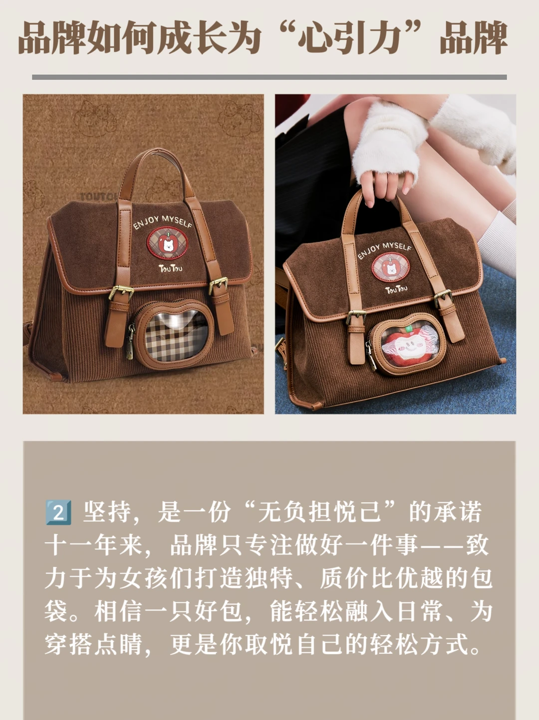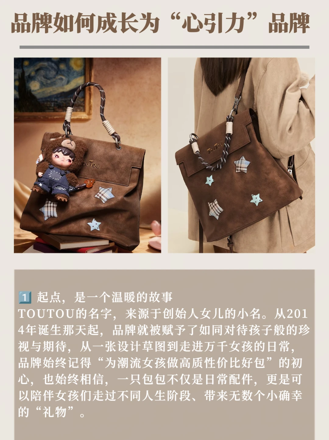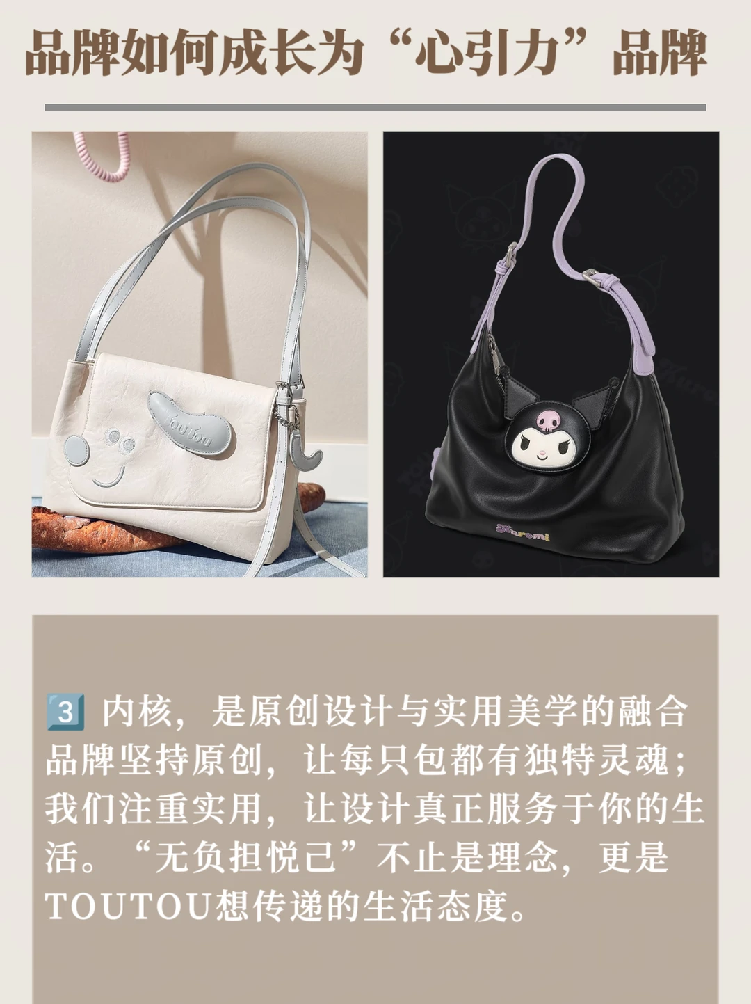 品牌坚持原创,让每只包都有独特灵魂;我们注重实用,让设计真正服务于你的生活。“无负担悦己”不止是理念,更是TOUTOU想传递的生活态度。