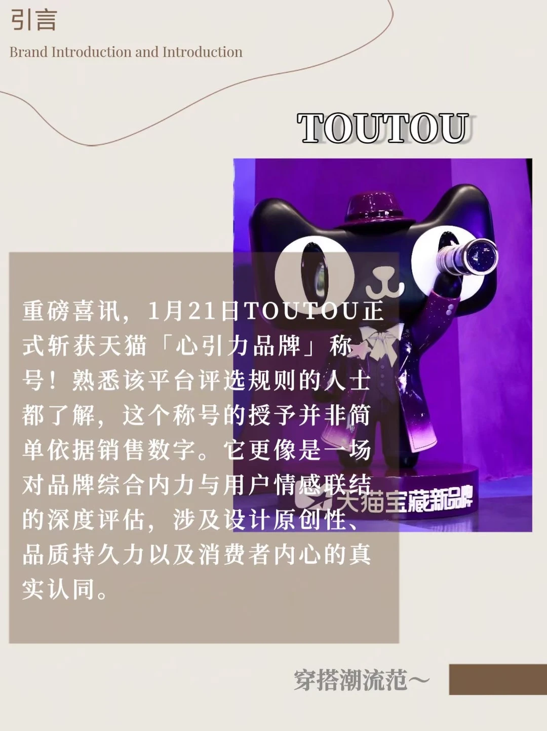 重磅喜讯,1月21日TOUTOU正式斩获天猫「心引力品牌」称号!熟悉该平台评选规则的人士都了解,这个称号的授予并非简单依据销售数字。它更像是一场对品牌综合内力与用户情感联结的深度评估,涉及设计原创性、品质持久力以及消费者内心的真实认同。