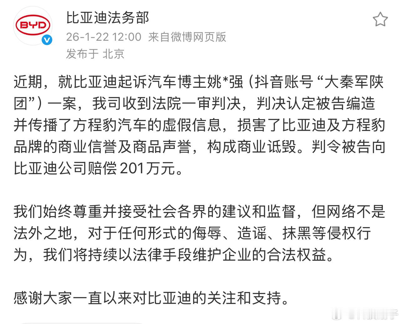 必须为这个判决拍手叫好!姚十八打着车辆测试的名义,刻意用极端驾驶方式操作,转头就把油耗超标、性能拉胯的锅全甩给车辆,这哪里是客观评测,分明是蓄意带节奏抹黑。抵制黑公关还网络一片净土,法院的判决拎得清:行业需要监督,批评也完全可行,但底线是不能造谣传假。201万的赔偿不只是对个人的追责惩戒,更给整个汽车测评圈划下红线。流量从来不能靠编造事实,靠黑红博眼球终究走不长远。比亚迪这次较真特别有必要,市场需要监督,但更需要干净的舆论环境。若人人都能随意捏造数据、恶意抹黑产品,最后吃亏的必然是消费者,真实用车体验被淹没,想真诚分享的人也会噤声。抵制黑公关、守住事实底线,让讨论回归产品本身,才是对用户、对踏实做产品的企业最公平的事。 方程豹胜诉姚十八