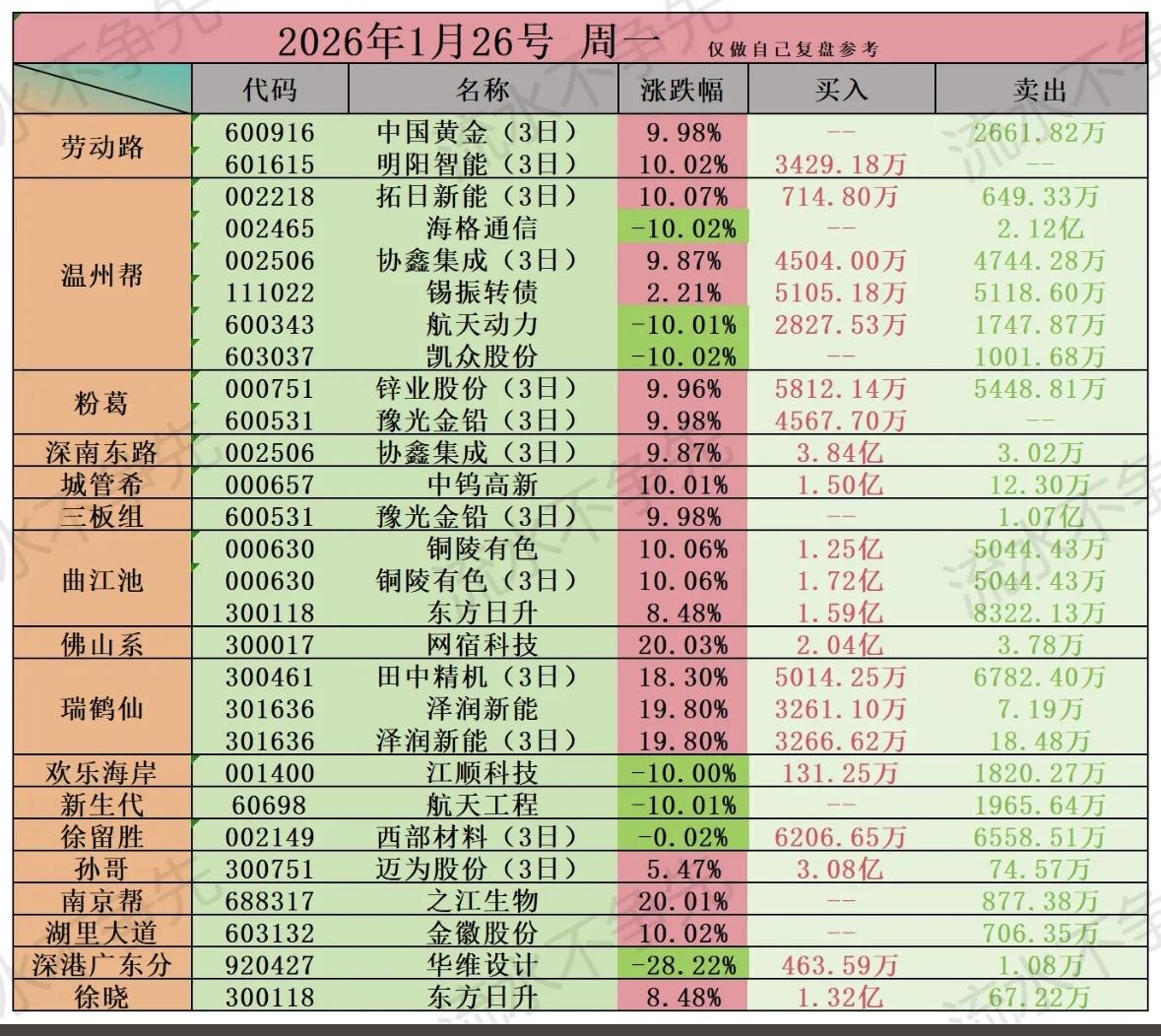 1月26日柚子龙虎榜今天股票涨跌情况一览表。 "股市复盘:九鼎新材涨停10%,泽润能涨近20%,通宇通讯活跃,游资章盟主布局德恩精工,黄金股异动。"