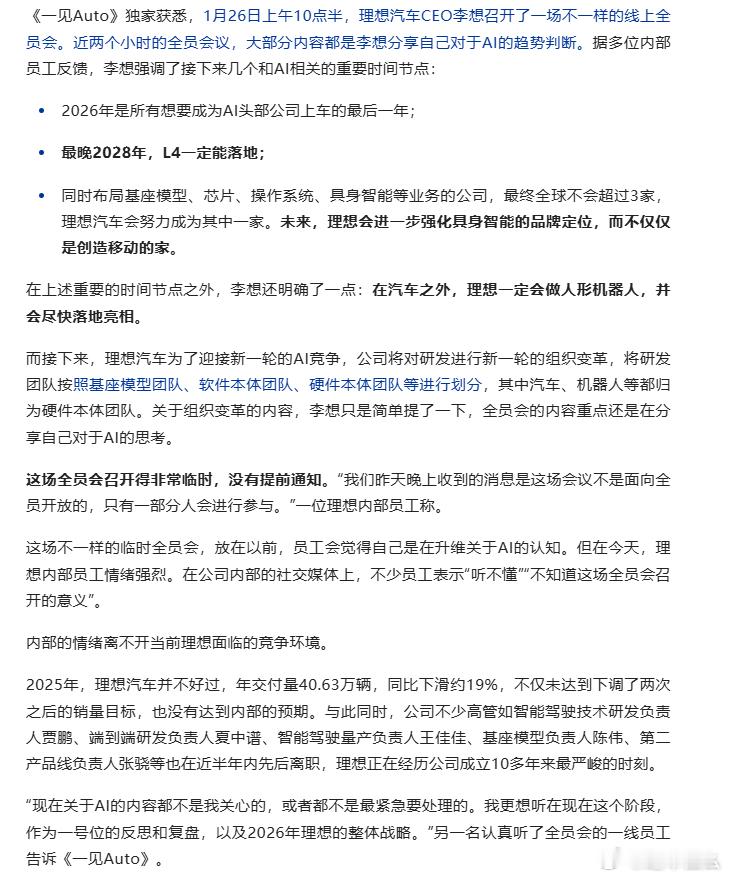 理想今年将梭哈AI?据悉,今天的上午,理想汽车CEO李想召开了线上会员会,主旨就