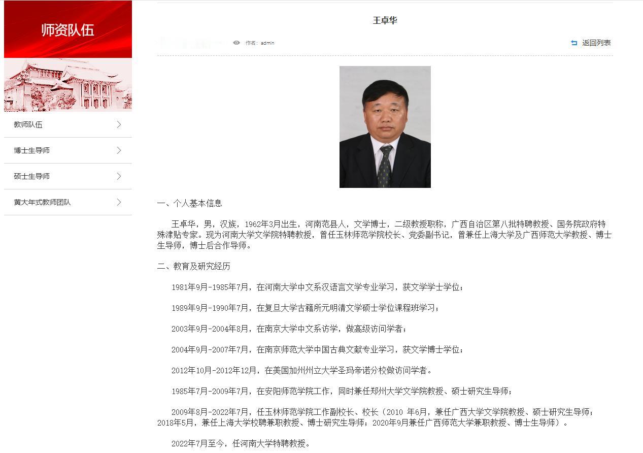 广西从河南挖来的人才,出事了!河南大学跟着尴尬 1月26日,广西发布了前玉林师范学院院长王卓华接受调查的通报,王卓华曾经是广西从河南挖来的优秀人才,其跌宕人生轨迹令人唏嘘。 王卓华是河南大学中文系校友,毕业后便分配到安阳师专中文系任教,他见证了安阳师专更名安阳师范学院的辉煌历程。 2009年,王卓华从安阳师范学院跳槽到广西,一度成为广西特聘专家、教育部评估中心审核评估专家、国家社科基金重大项目首席专家。 广西对王卓华也非常信任,给他了一个很大的发展空间,王卓华执掌玉林师范学院多年。在广西工作期间,也是王卓华职业生涯最辉煌的时刻,但是他辜负了广西的信任。 出生于1962年的王卓华,2022年年满60岁后,卸任玉林师范学院校长,如今退休将近4年,仍然是倒在了腐败的深渊。 值得一提的是,王卓华卸任玉林师范学院校长后,被家乡的河南大学聘为特聘教授,他的落马,让河南大学也跟着尴尬。