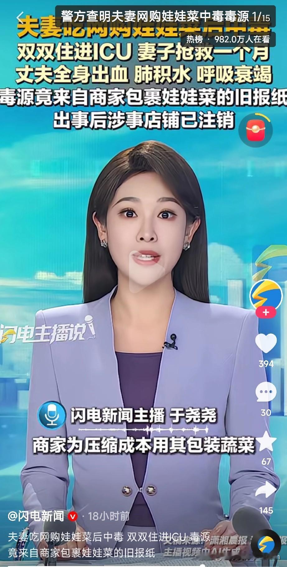 警方已经查明网购娃娃菜中毒毒源 浙江台州一对夫妻,花17块钱网购了8斤娃娃菜,想着图个便宜,结果差点把命搭进去! 食用当晚,两人就开始流鼻血、嘴巴起血泡,血止不住,直接送进ICU抢救!丈夫全身出血、肺积水、呼吸衰竭,妻子在ICU躺了一个月才捡回一条命! 一开始还以为是啥怪病,结果警方一查,毒源竟在包装娃娃菜的旧报纸上! 原来,商家为了省成本,用了回收来的旧报纸包蔬菜,而这些报纸之前存过沾了老鼠药的东西,毒素直接渗透到菜里! 这老鼠药还耐高温,洗都洗不掉,吃下去当场完蛋! 现在涉事店铺已注销跑路了,但平台已经交出店主信息,警方正在追查全链条责任! 提醒大家: 网购生鲜一定选正规平台,看资质、看评价! 收到菜仔细检查包装,有问题直接退! 便宜莫贪,命比菜金贵!安全第一! 希望警方赶紧揪出商家,严惩不贷!也盼平台别再和稀泥,好好把食品安全关!