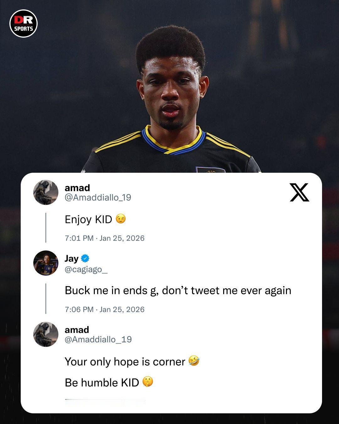【嘴炮】阿森纳2-3负于曼联,阿马德·迪亚洛和一位名叫Jay的阿森纳球迷在社媒打嘴仗😂! 赛前👇 Jay:他们刚把剧本发给我,阿森纳4-0赢下比赛! 赛后👇 迪亚洛:慢慢享受吧,小子😉。 Jay:别来烦我了哥们儿,以后别再给我发消息了。 迪亚洛:你唯一的希望就是角球了😂,放尊重点,小子😉。阿森纳2-3曼联