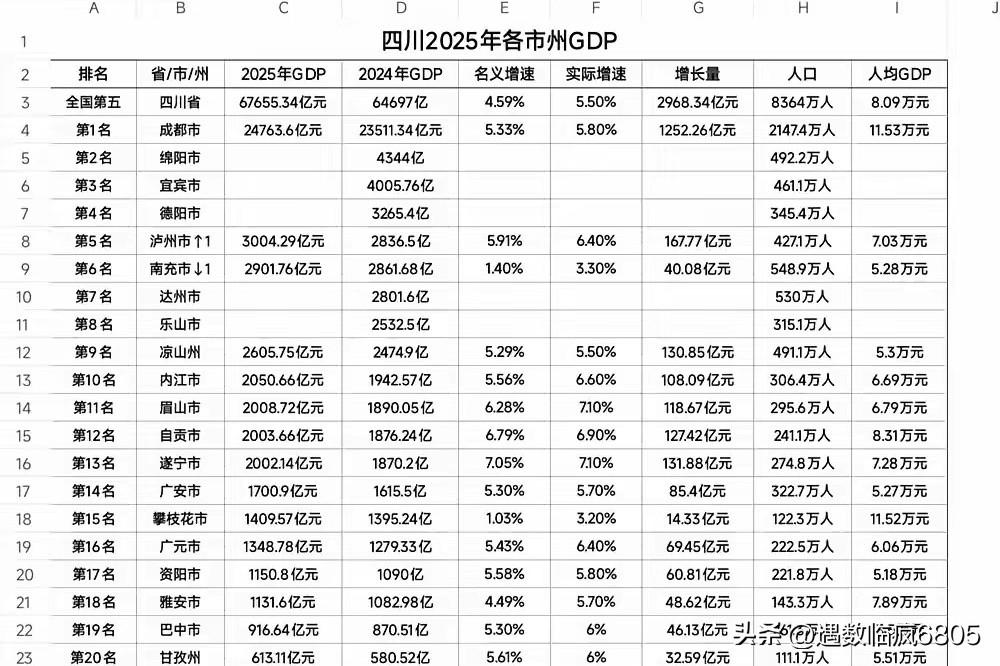 南充2025年GDP名义增速仅1.4 %,比省均增速低4个点,增量仅4 0个亿(不及年老三巴中),被泸州正式超越。达州虽还未公布,估计增速不会低于省均,若增量超过200亿,将把南充再挤下一位。 南充要加油啊