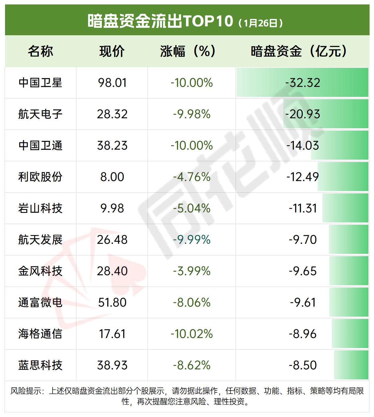 1月26日,周一A股主力暗盘资金流入流出一览表!!! 今日,主力资金流出752.64亿,主力暗盘资金大幅流出146.41亿,亨通光电主力暗盘资金大幅流入18.82亿,后市值得期待;紫金矿业主力暗盘资金大幅流入超12亿;中国卫星主力暗盘资金大幅流出32.32亿,后市需注意风险!!!