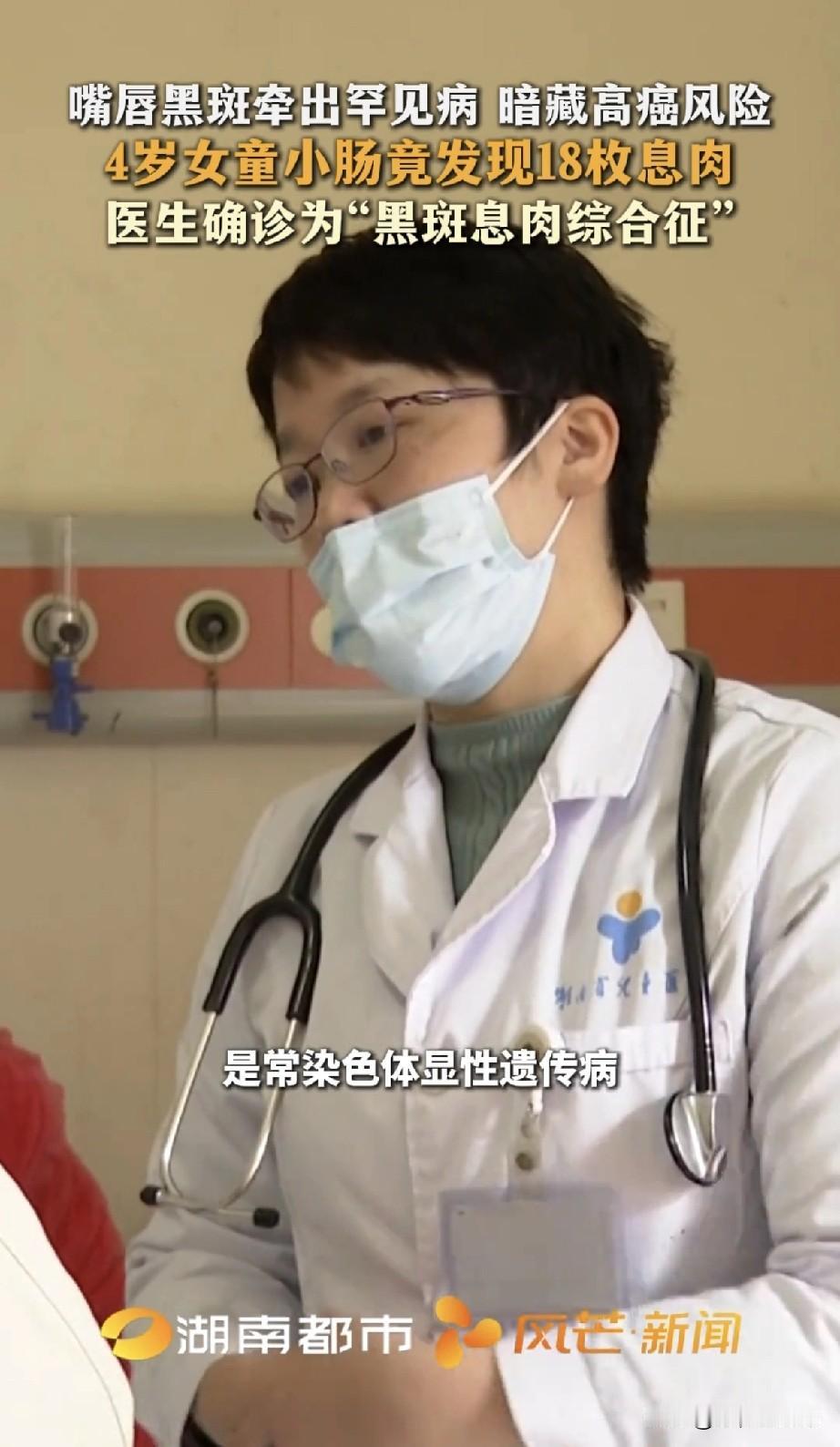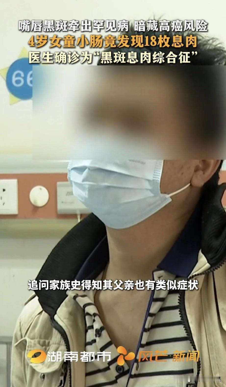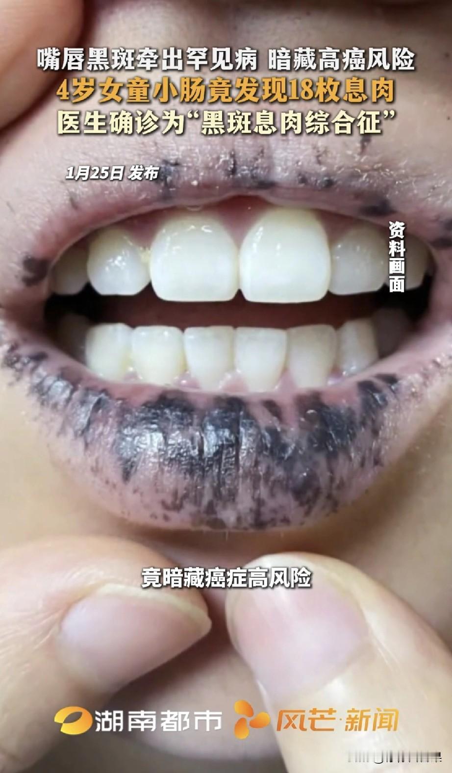 4岁娃嘴唇长黑斑,一查肠子塞满18枚息肉!医生:这病会遗传还致癌! 湖南一个4岁小姑娘,嘴唇一圈长了密密麻麻的小黑斑,家长一开始以为是胎记没当回事。 结果去医院一查,医生在她小肠里揪出了18枚息肉,最大的都有2.5厘米大,差点把肠子堵死! 这病会遗传+高癌变风险,不是普通胎记! 娃嘴唇、手脚有黑褐色斑点,或总喊肚子疼、便血,立刻去医院! 一人得病,全家都要筛查! 这病虽然少见,但漏诊了可能拖成大病。 家有娃的现在就看看娃的嘴唇,别让小斑点变成大麻烦!