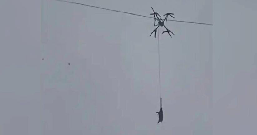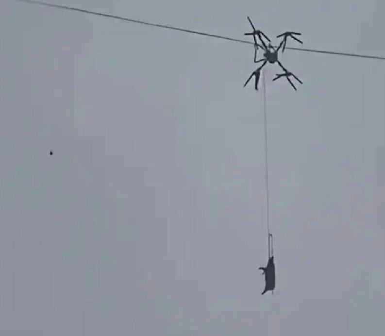 #猪飞天#四川巴中通江县铁佛镇,上周六(24 日)凌晨,有村民尝试用无人机吊“年猪”下山宰杀,不料无人机连猪一同压毁高压线,致使整条村停电 10 小时。 铁佛镇一名村民用无人机分批吊运自家多只年猪下山屠宰,运送第一只猪时就出了意外。 事发时天未亮,能见度低,村民操作无人机吊运生猪,绳索缠上高压线,无人机和生猪一同挂在空中,造成全村停电。
