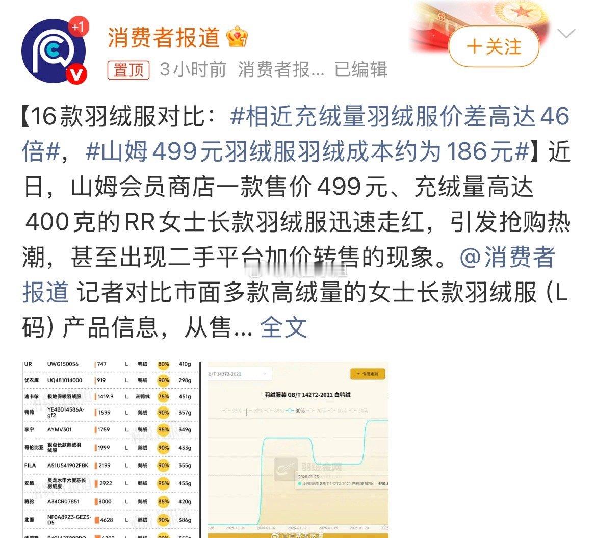 服装除了生产成本,还有销售成本,包括售后及损耗,成本186售499,已是非常良心价!山姆499元羽绒服羽绒成本约为186元