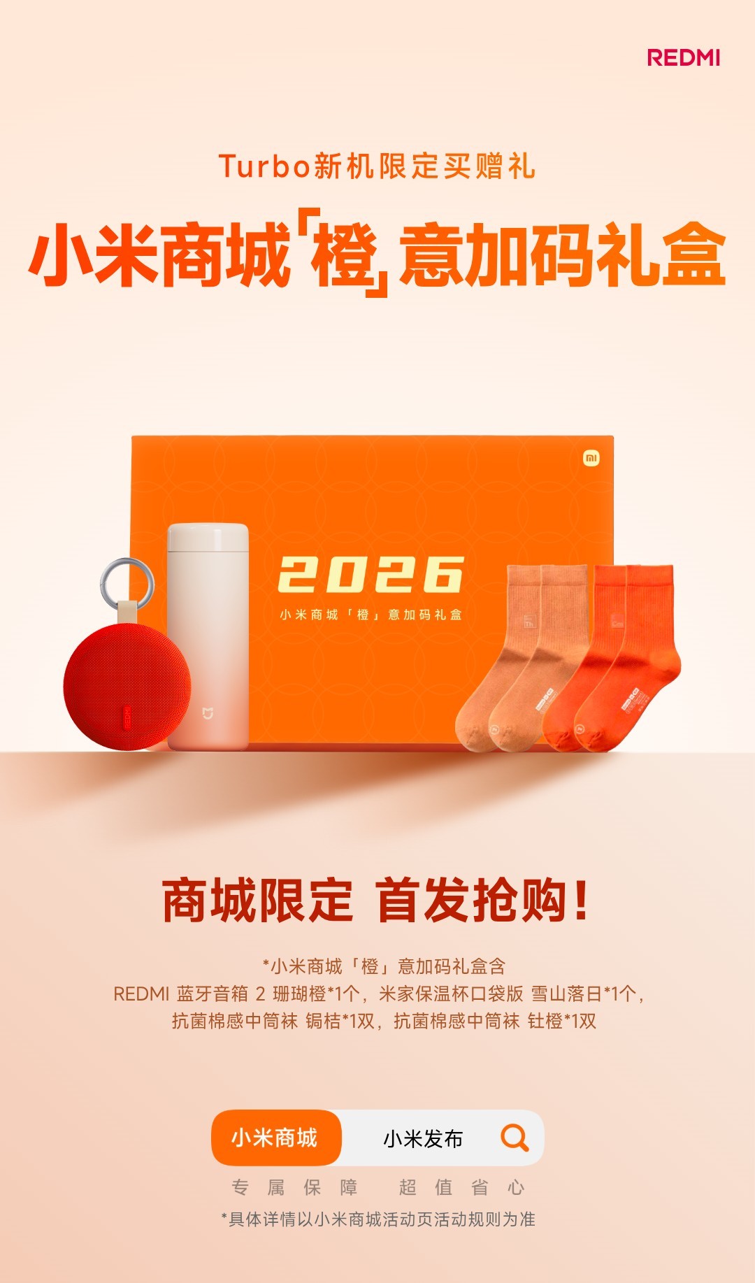 转发本条,抽一套橙意礼盒↓ 「REDMI 蓝牙音箱2」+「口袋保温杯」+「橙色厚袜子」准备入手Turbo5 系列的朋友,欢迎到小米商城入手,首发买赠也送这个套装 抽奖详情