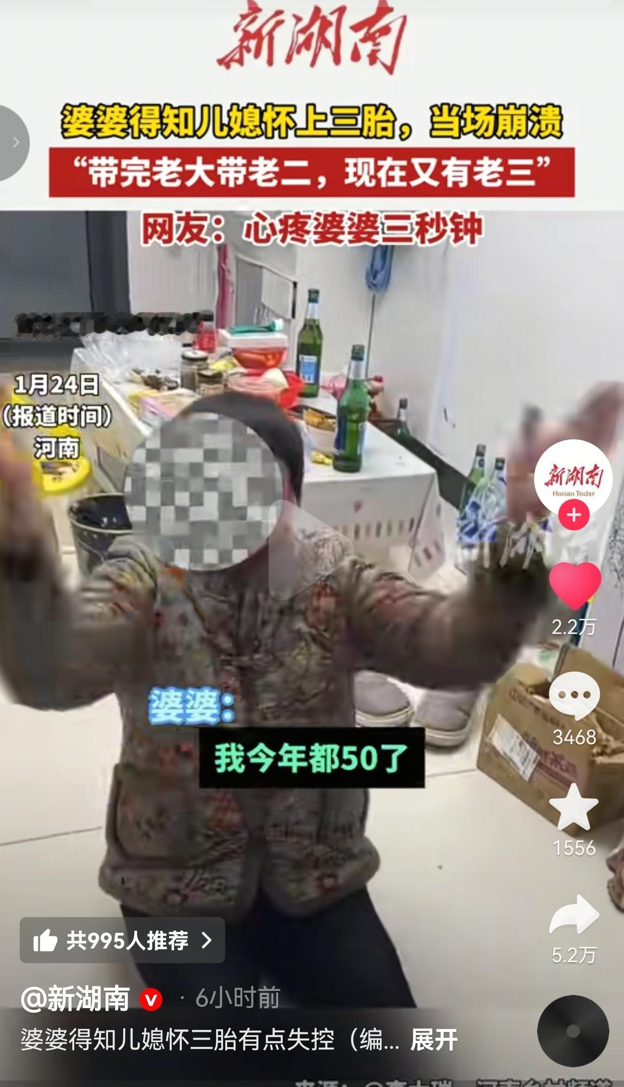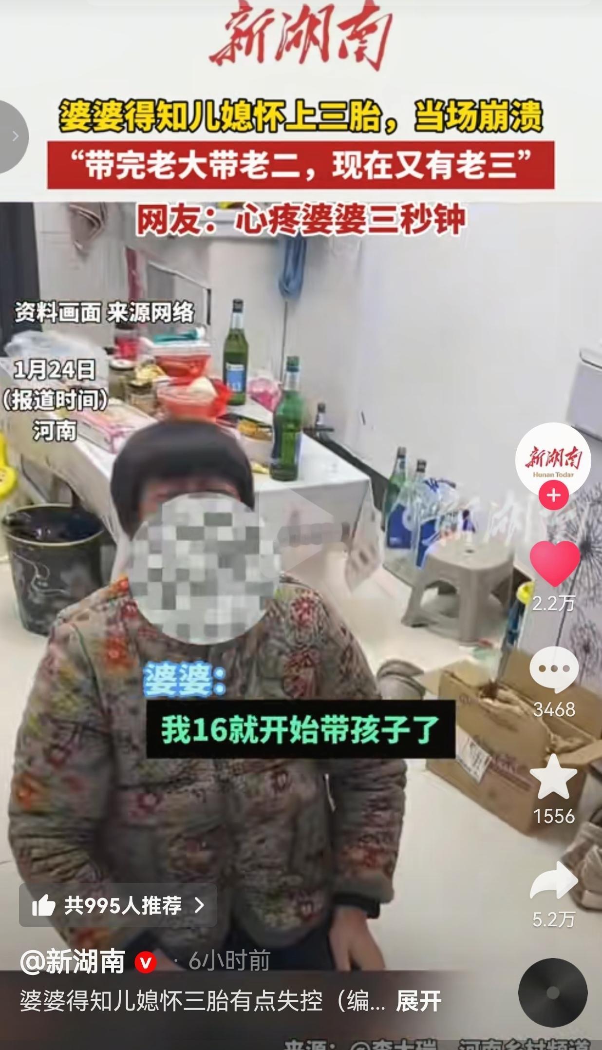 看给老人委屈的?别再让婆婆给你们小夫妻带孩子了!让婆婆享享福吧! 1月24日,河南一女子把自己怀孕的喜事告诉了婆婆,本以为婆婆会高兴,结果,当这位婆婆得知儿媳怀上了三胎,当场崩溃大哭,拍着大腿喊:“老天爷呀!你还叫我活不了!带完老大带老二,现在又有老三!” 儿媳妇说:“妈,你当奶奶不应该高兴吗?” 婆婆苦笑着说:“我高兴个球啊!我从16岁就开始带孩子,今年都已经50了!我给恁带大了老大老二,恁又给我生个老三!这带娃的日子,什么时候是个头呀!”  网友看到后评论说:“看着婆婆的反应,我笑着笑着就哭了,这哪是当奶奶,明明是把婆婆当成了免费的保姆。” 也有的网友说:“婆婆不是怕带孩子,是怕自己一辈子都在带孩子的循环里。” 还有的网友说: “这个事情儿媳没错,婆婆也没错,错的是一家人默许让婆婆带孙子。” 婆婆的话说出了中国千万老人的心声:从结婚生子开始带自己的孩子,本以为儿子长大了,就不用带孩子了。 没想到的是,等到带儿子结婚生子,还要帮儿子带儿子,这一生好像都在带孩子,一点自己的时间也没有。她们的人生仿佛永远在“带娃”,你说,这事搁在谁的身上,能不崩溃呢? 所以说,老人既然带孩子带的够够的,不想带孩子了,身为老人的儿子和儿媳妇,你们也要尊重老人的想法,让老人过一过自己的小日子吧! 对此,你有什么看法呢?