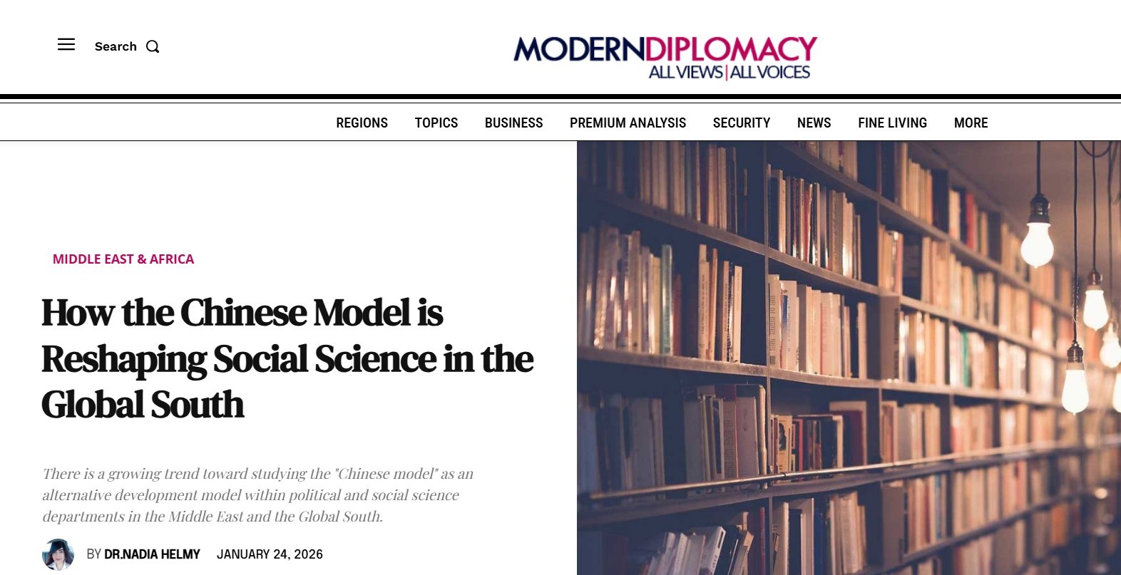 欧洲《现代外交》近日刊登埃及本尼苏伊夫大学副教授纳迪亚·赫尔米博士的署名文章《中国模式如何重塑全球南方社会科学》。作者在文章中表示,在全球南方国家高校的政治与社会科学院系中,将“中国模式”作为一种替代发展模式展开研究的趋势正日益凸显。