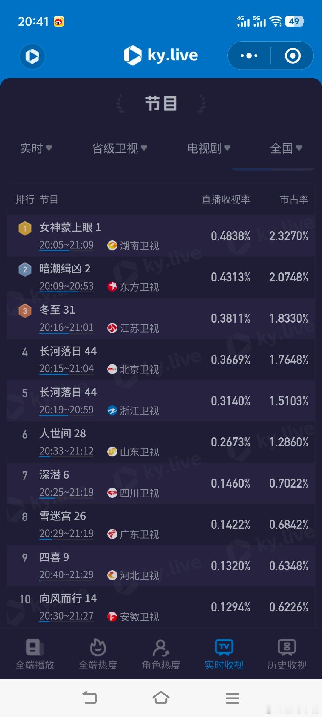 没人发现吗?卫视也是好起来了!好久没看到这个景象了!湖南:女神蒙上眼0.5东方:暗潮缉凶0.4+江苏:冬至 0.38北京:长河落日0.36浙江:长河落日0.31三台0.3,一台0.4,一台0.5