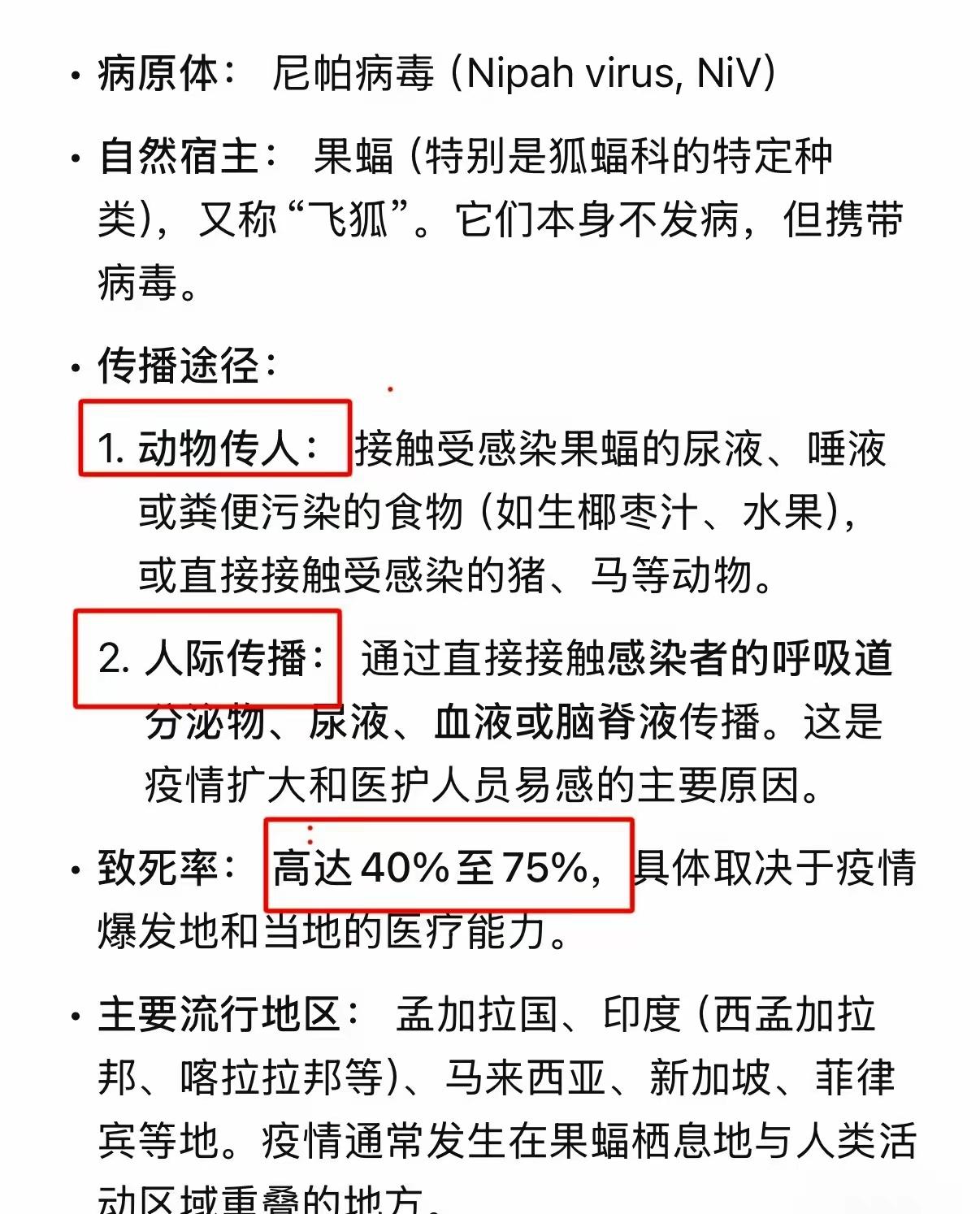 老特已经让美国退出了世卫组织,这个时候,印度就爆发出了疫情。 就印度境内出现的这个尼帕病毒,不得忽视呀。它可是一个能让人致命的病毒,致死率高达75%。 在印度这个人口基数庞大的国度里,已经是出现了有人感染的迹象,而且当地的卫生医疗技术并不发达,不敢想象,如果病毒扩散开来,是个什么样的后果。 尼泊尔、泰国这些国家,已经在边境设置了严查的封锁线。眼看这个节骨点,就要过春节了,大家都要忙着回家团圆过节了,我国真的要提高警惕才行呀,至少要有预案紧急措施才行,不至于发现情况太被动。