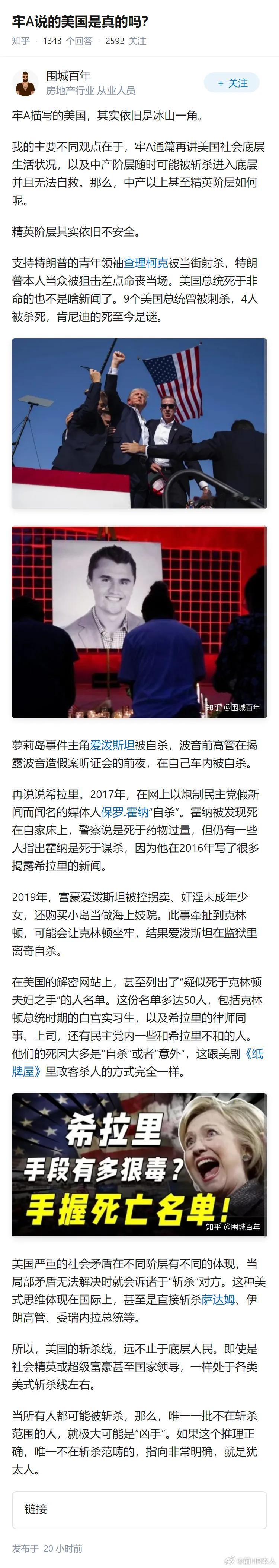 牢A说的美国是真的吗?不仅仅是真的,还不够,比如爱泼斯坦的萝莉岛问题,希拉里暗杀名单问题都是耸人听闻的。