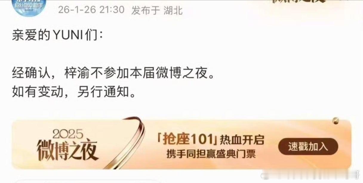 田栩宁、梓渝都确认不参加微博之夜