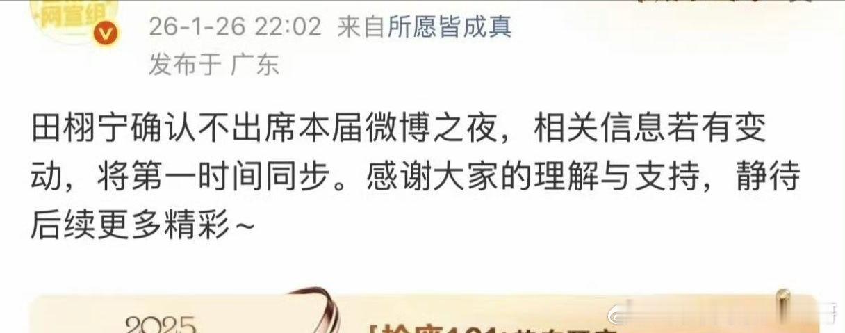 田栩宁、梓渝 都确认不参加微博之夜