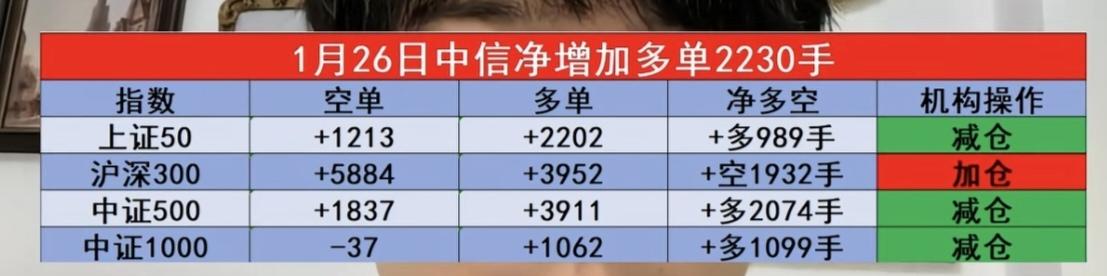1.26周一晚间 利空来了!中信、机构大幅减仓出逃!最新期指数据来了! 中信净增加多单2230手 机构净增加多单5716手 从期指数据看,今天中信和机构都是大幅减仓的。 今天大盘、小盘继续分化,从数据看某队还是在继续大幅减仓,控制好仓位。 后续大小盘股可能还会继续分化,呈现指数不跌,个股跌。 不作为投资买卖建议,仅供参考