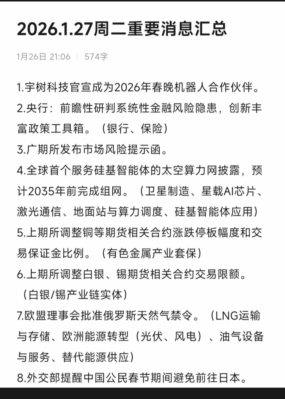 1.27周二 重要财经消息汇总! 1.宇树机器人官宣春晚合作 2.太空算力 3.星载AI芯片,激光通信 4.天然气 5.跨境电商,数字货币
