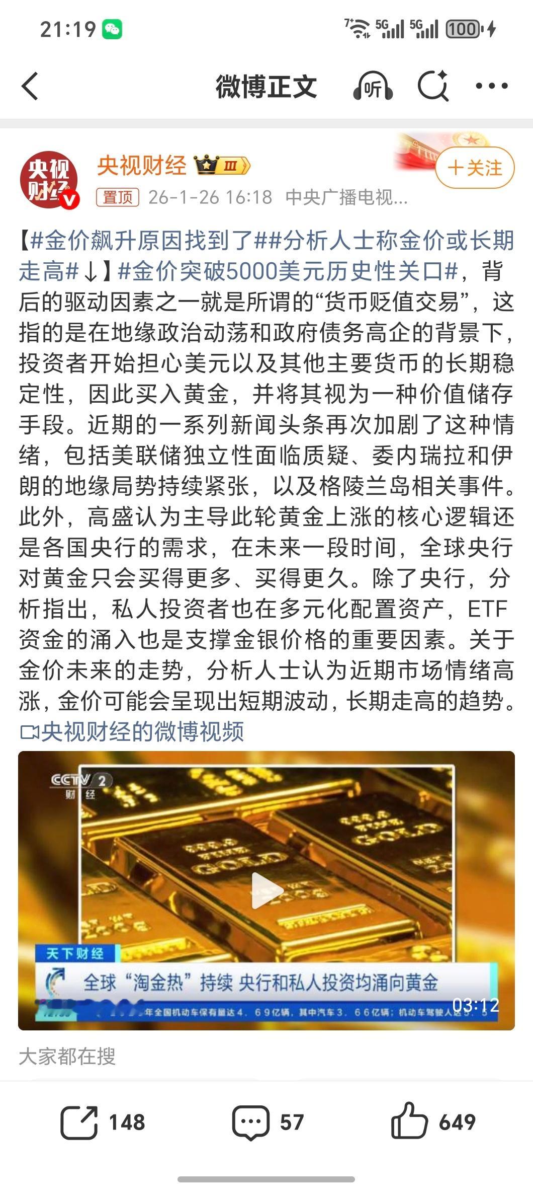 金价飙升原因找到了2026开年金价一路狂飙,现货黄金站上5000美元/盎司历史关口,三个月涨超千美元归根到底地缘争端升级、全球政治不确定性加剧,推高避险需求,各国央行都不买美债 改买黄金了,昨天商场里排队买黄金,也是大家都觉得过年期间还会涨,全球各地都在囤