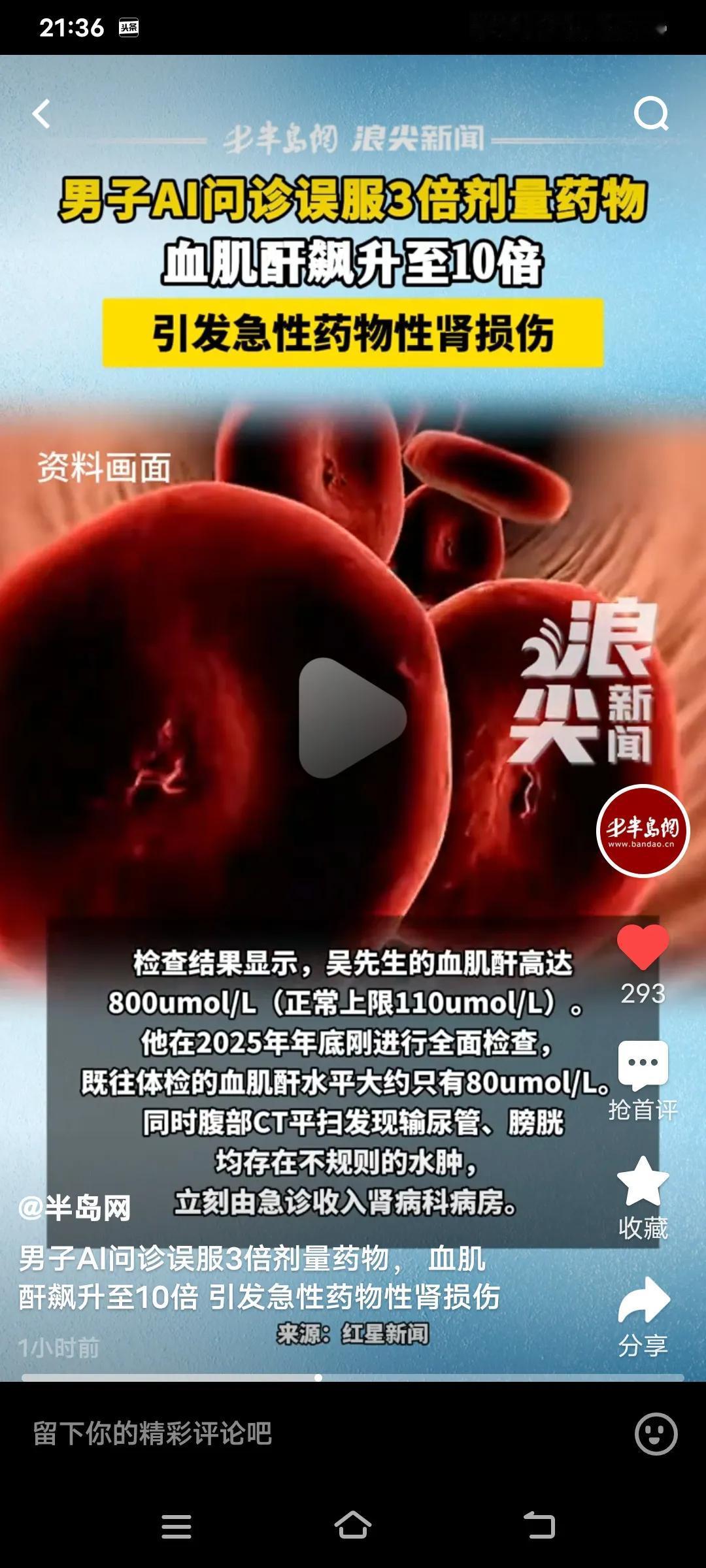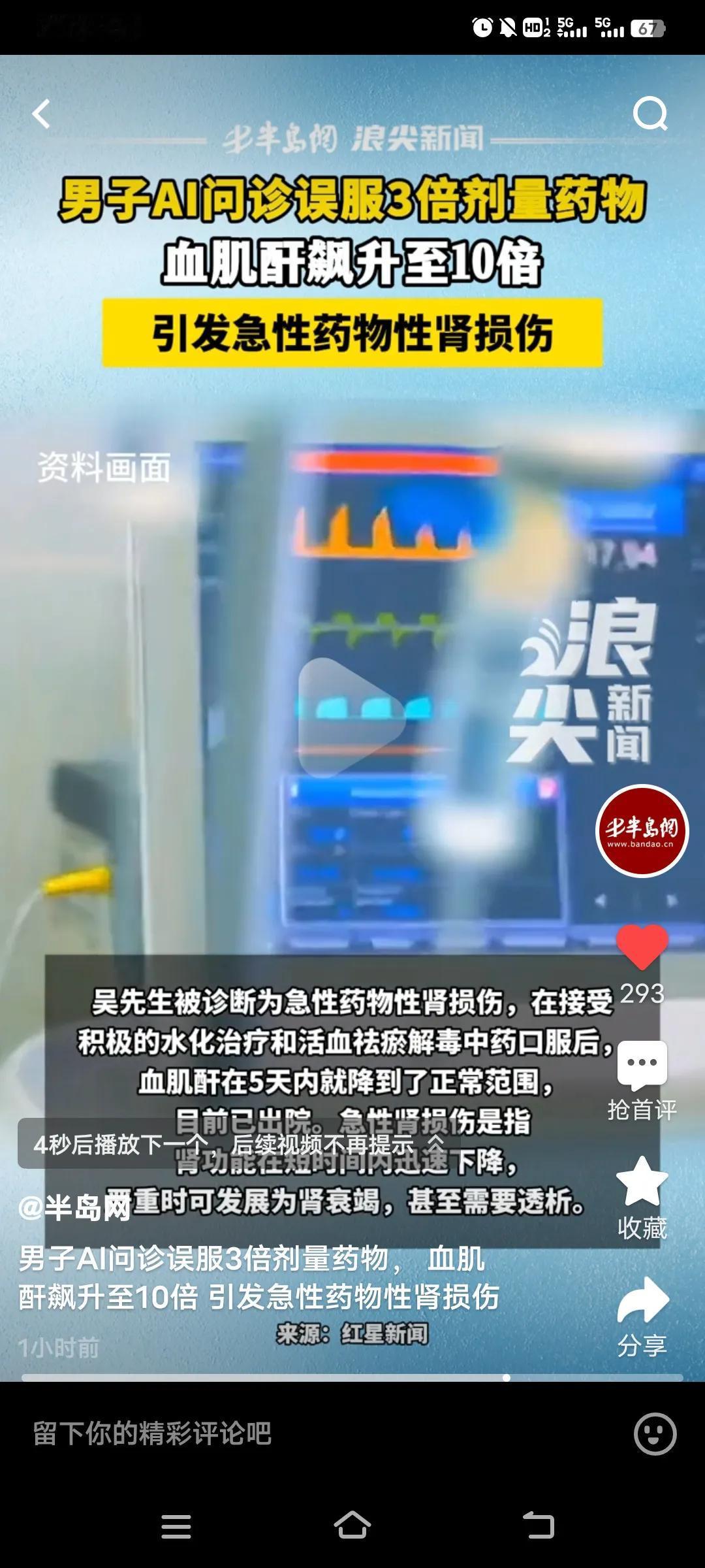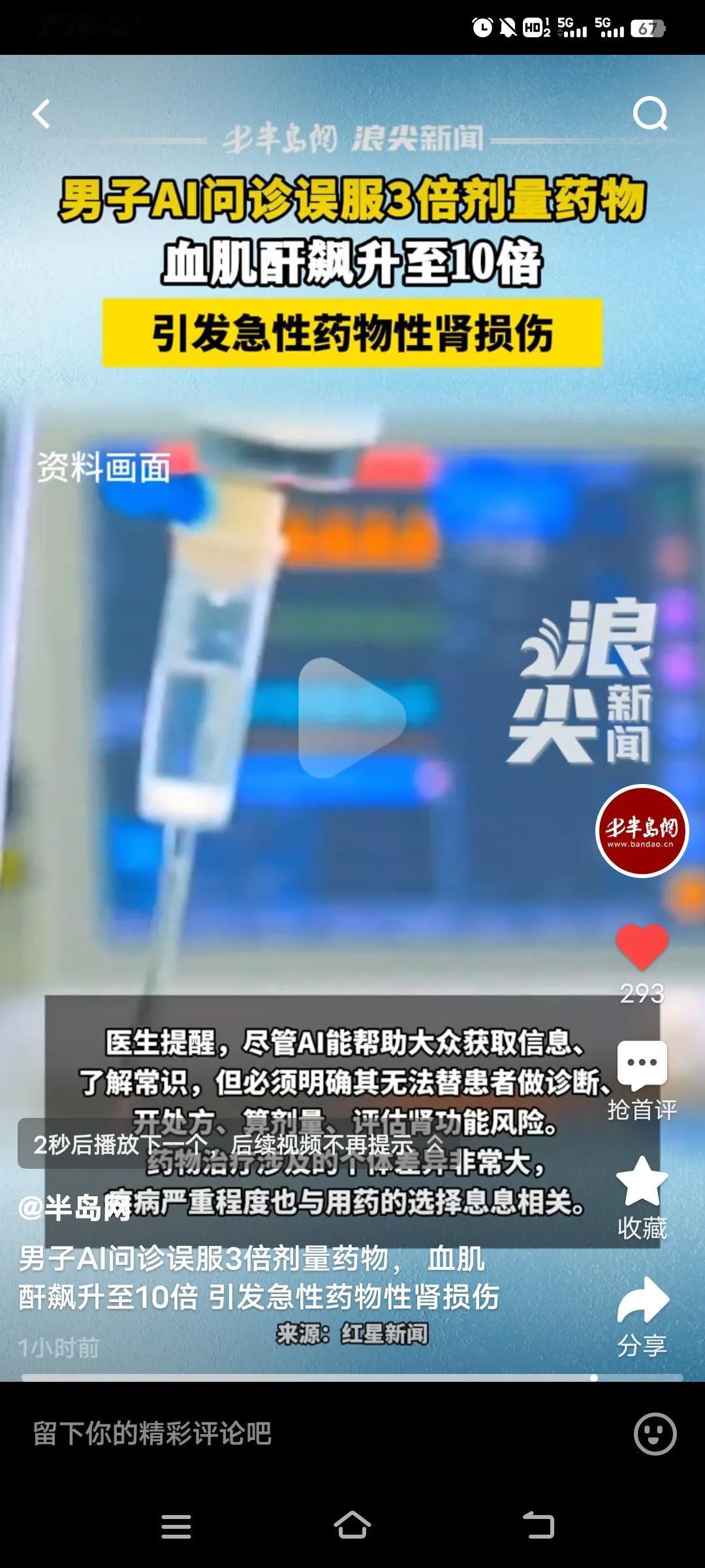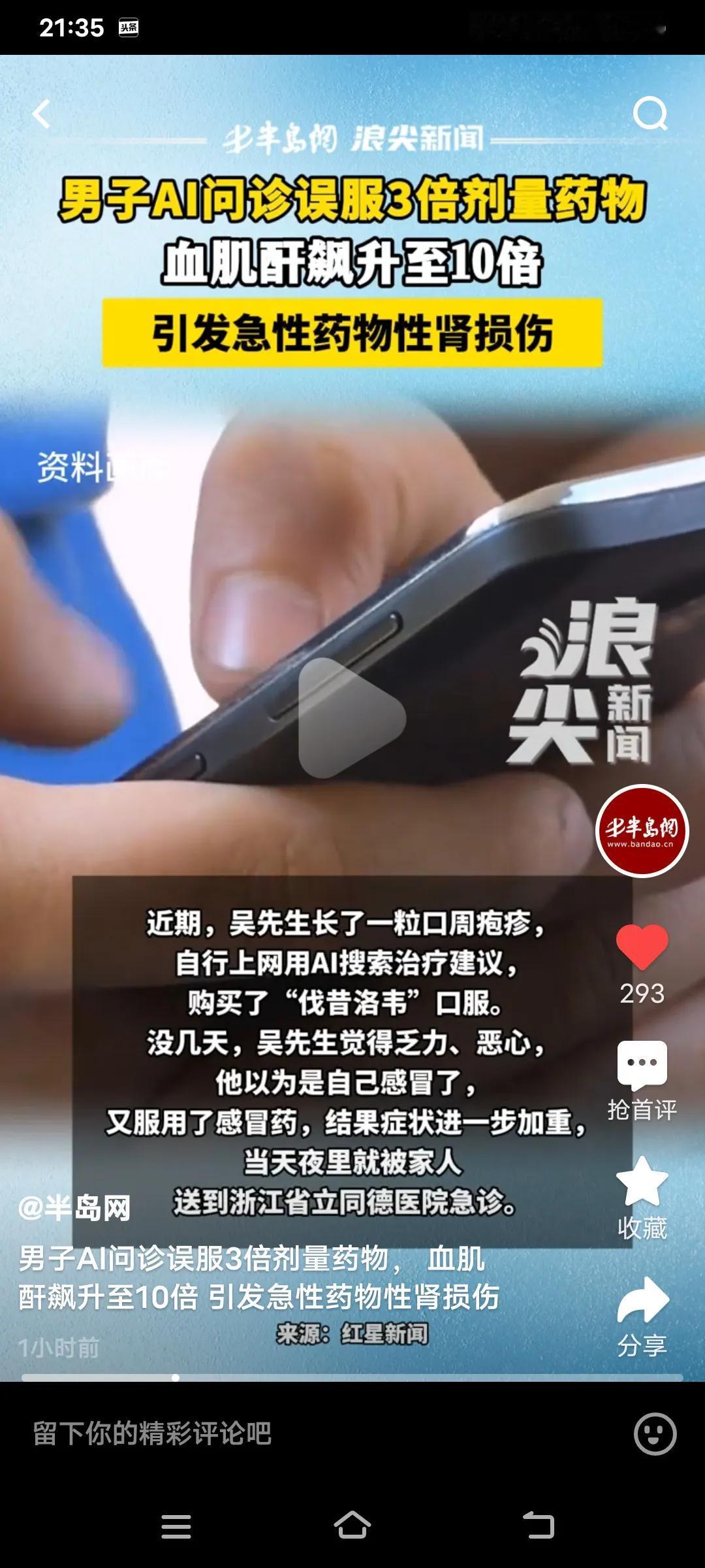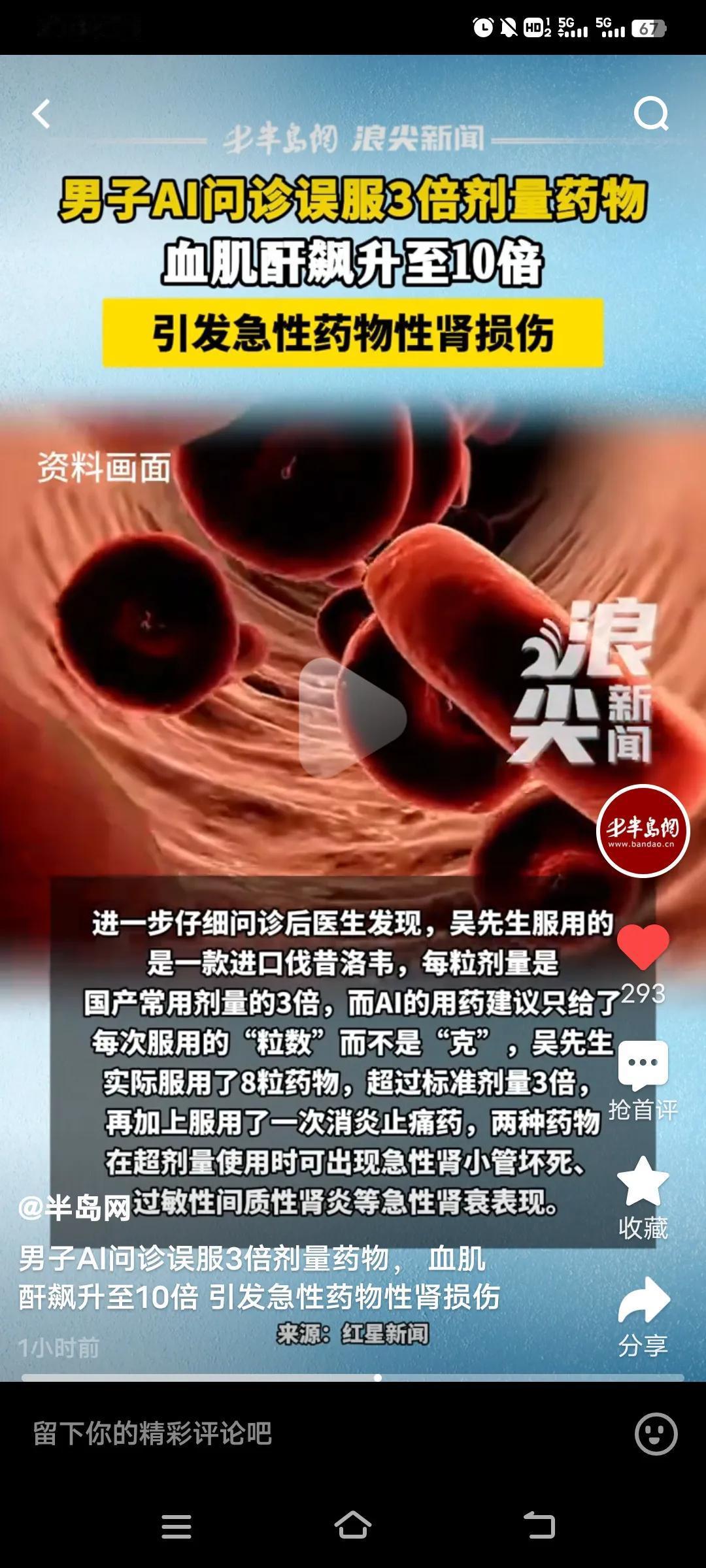 如今AI,比较火热。然而近日,浙江的吴先生使用AI问诊,却被误导用药,致使血肌酐飙升至10倍,最终引发急性药物性肾损伤。 原本,吴先生只是长了一粒口周疱疹,他通过AI搜索建议用药,购买了“伐昔洛韦”。口服几天后,他感到乏力、恶心,以为是感冒,便又服用了感冒药,结果病情加重,当天就被家人送往浙江省立同德医院。检查结果显示,吴先生血肌酐增高,引发了急性药物性肾损伤。 由此可见,生病真不能依靠AI来指导,它怎么也比不上医生诊断精准。可不能拿生命开玩笑,好在抢救及时,否则就麻烦了。吴先生的血肌酐在5天内就降下来了。 医生提示,AI虽能帮助大家获取信息,但不能用于诊疗。所以我们要尊重医生的建议,不能盲目依照AI的建议取药,而且医生还指出,一粒进口药是国产的3倍。 这也给大家敲响了警钟,生病了最好去正规医院,让专业医生进行诊断,这样才能确保治疗安全有效,千万别拿自己的健康不当回事。 ai医疗诊断 AI医学 ai诊断报告