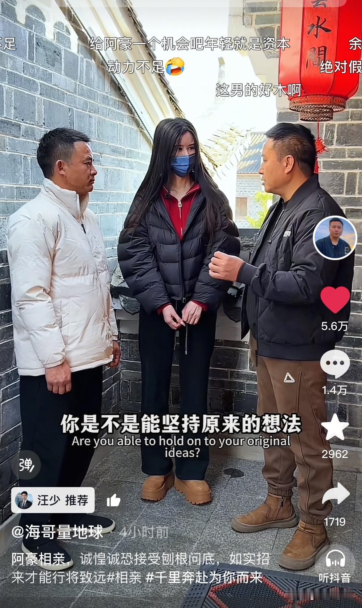 网上铺天盖地都是对蓉儿和阿豪分开的怀疑。 理由便是海哥拍摄的阿豪视频突然下架。 当然,几个小时之后,视频又恢复正常。 这中间究竟发生了何事,大家众说纷纭。 海哥在直播中解释,蓉儿家人似乎持反对意见,而蓉儿正顶着压力坚持着。 海哥担心蓉儿承受不住来自各地的压力,便劝解她现在退出还来得及。 没想到蓉儿已然豁出去,义无反顾,不知这是否就是爱情。 海哥称,已经在筹备蓉儿回江西的仪式。 事实证明,爱情或许可以不要面包。 海哥又成功促成了一对! @海哥量地球(16-18号年货节)