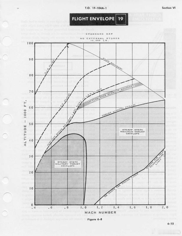 既是“机棍”又是穿云箭:F-104星战士含跃升的完整包线,飞机无外挂,飞行重量16000磅,标准大气条件。最内侧的曲线是军推包线,可以看到星战士从海拔1000米开始就能用军推突破音速,比许多三代机军推超音速起始条件要宽松。第二条包线分别受最大速压、发动机进气口温度、飞行稳定性和发动机剩余推力限制,代表飞机日常稳定操作包线。F-104是单垂尾飞机,和许多2代机一样受超音速横侧稳定性限制,尽管发动机推力还很充裕,飞机阻力也比较低,但是无法再快。推力限制上面的阴影线是发动机稳定工作上限,高于此高度加力燃烧室将无法正常点火。阴影线上面是飞机特殊1g包线:J79发动机因极限工况导致APC自动补油产生更大推力,从而产生的特殊1G包线。这段包线有一定风险,并非飞机常用的飞行极限。再上面两根虚线对应0.5g和0.1g包线,飞机正常爬升不可能达到,需要通过合理的跃升飞上去。0.1g包线高度已达到100千英尺也就是30.48公里。从包线图我们可以看到星战士受限于整体布局,速度并不高,但是出色的爬升率结合发动机工作包线,能够达到相当高的高度。