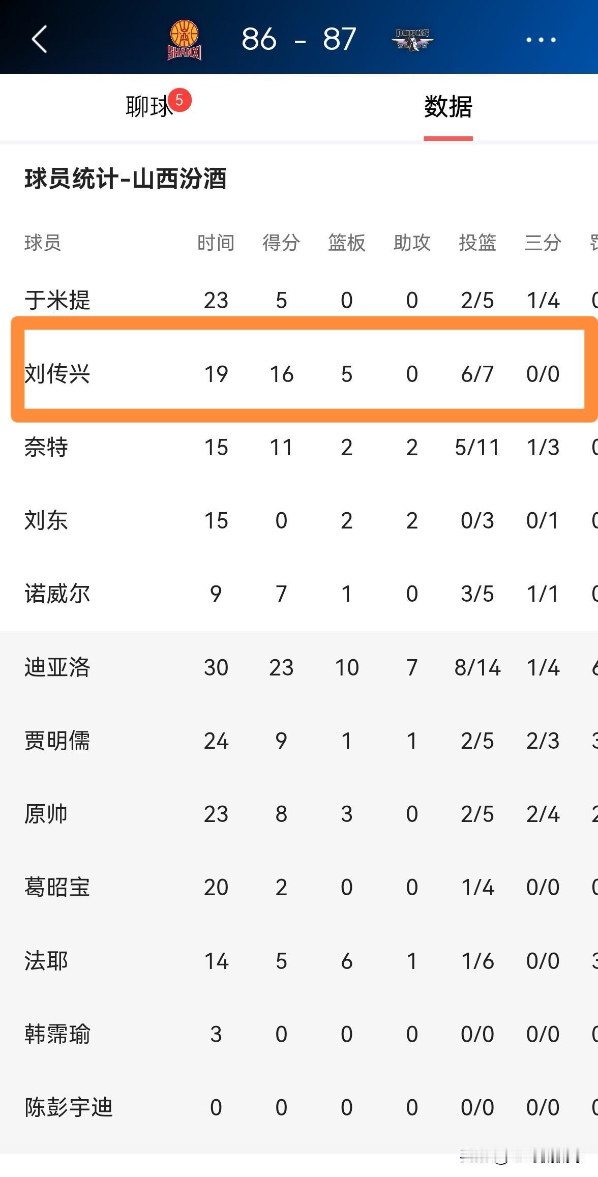 山西汾酒中锋刘传兴不愧是当今CBA顶级中锋之一!虽然今天山西汾酒在主场以86:87不敌北京北汽,但是刘传兴在篮下展现出了非常强的得分能力,他在首发出战的19分钟里,投篮7中6,其中罚球6中4极其高效的砍下16分,还有5篮板1抢断,没有出现任何的失误,不过有4次犯规。 如果刘传兴能够在以后的比赛中可以更好的控制自己的犯规数,那么他完全有机会入选中国男篮国家队。