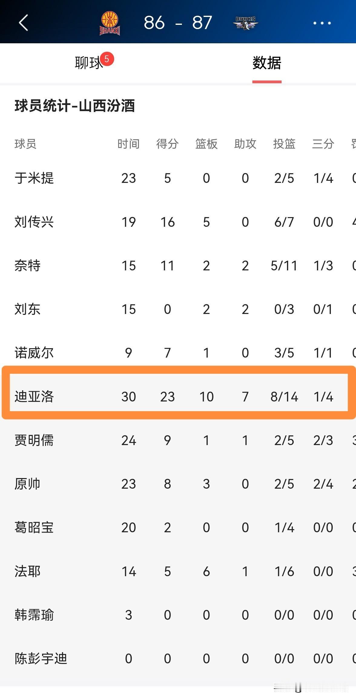 我要好好的夸夸山西汾酒外援迪亚洛!虽然今天山西汾酒在主场以86:87惜败于北京北汽,但是迪亚洛在攻防两端的表现都是无可争议的,全场比赛下来,迪亚洛替补出战30分钟,投篮14中8,其中三分球4中1、罚球9中6得到23分10篮板7助攻2抢断1盖帽,他的场上正负值为+3。 此外,本场比赛迪亚洛在情绪管理方面做的非常出色,整场比赛下来他基本上没有和对手还有裁判发生争执,这是值得称赞的地方。