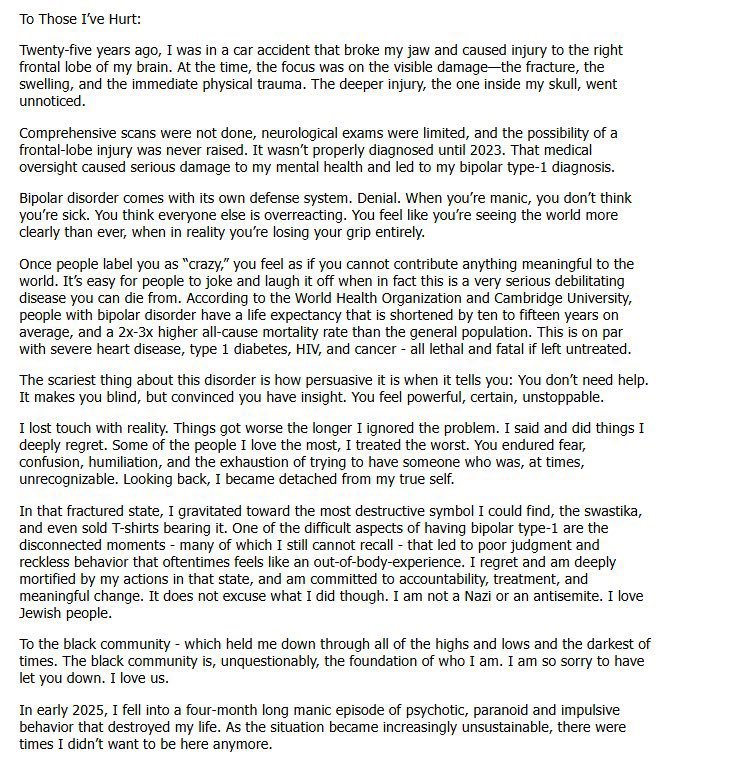 活久见!坎耶在华尔街日报刊登长篇道歉声明!在声明中坎耶表示,二十五年前的车祸造成脑损伤,留下了后遗症,但他自己没有注意到。直到2023年确诊为双相情感障碍。这几年的疯言疯语(包括反犹、纳粹等言论)都源于躁狂发作。他对伤害亲人和公众的行为深感悔恨,并明确表示自己不是纳粹或反犹主义者。2025年初的一次严重躁狂发作几乎摧毁他的人生,也促使他在妻子鼓励下寻求系统治疗。如今他正通过药物治疗和健康生活方式恢复清醒,将精力投入音乐与创作,并请求公众给予耐心与理解,而非同情或赦免。【道歉声明全文】致我曾伤害过的所有人:25年前,我遭遇了一场车祸,事故导致我的下颌骨骨折,并对大脑右侧额叶造成了损伤。当时,所有注意力都集中在那些“看得见”的伤害上——骨折、肿胀以及即时的身体创伤。而真正更深层的伤害,那些发生在我颅骨内部的损伤,却被忽视了。当时并未进行全面的脑部扫描,神经学检查也十分有限,额叶受损的可能性从未被提出。直到2023年,我才被正确诊断出来。那次医学上的疏忽对我的心理健康造成了严重伤害,并最终导致了我被诊断为双相情感障碍(躁郁症)Ⅰ型。双相情感障碍自带一种“防御机制”——否认。当你处于躁狂状态时,你不会觉得自己生病了。你会认为是所有人都反应过度。你感觉自己前所未有地清醒、洞察一切,而实际上你正在彻底失去对现实的把控。一旦人们给你贴上“疯子”的标签,你就会觉得自己无法再为这个世界做出任何有意义的贡献。你会用笑话来化解,用笑声掩饰,但事实上这是一种极其严重、会致命的疾病。根据世界卫生组织和剑桥大学的数据,双相情感障碍患者的平均预期寿命会缩短10到15年,全因死亡率是普通人群的2到3倍。这一风险水平与严重心脏病、1型糖尿病、艾滋病和癌症相当——如果不加以治疗,都是致命的疾病。这种疾病最可怕的地方,在于它的“说服力”。它会告诉你:你不需要帮助。它会让你盲目,却坚信自己拥有洞察力;让你感觉自己强大、确定、不可阻挡。我逐渐与现实脱节。问题被我忽视得越久,情况就越糟。我说过、做过许多让我深感悔恨的事。我伤害得最深的,往往正是我最爱的人。他们承受了恐惧、困惑、羞辱,以及试图去爱一个在某些时刻已经“变得不像本人”的人的巨大消耗。回过头看,我已经与真正的自我彻底分离。在那种精神破碎的状态下,我被最具破坏性的符号所吸引——我公开使用了纳粹卐字标志,甚至穿戴带有该符号的T恤。双相Ⅰ型障碍最可怕的一个方面,就是那些“断片”的时刻——其中很多我至今无法回忆清楚——它们导致了极差的判断力和鲁莽行为,事后回想仿佛是一次“灵魂出窍”的体验。我对自己在那种状态下的行为深感懊悔与羞愧,并坚定地致力于承担责任、接受治疗,以及实现真正、有意义的改变。但这些都不能成为我所作所为的借口。我不是纳粹,也不是反犹主义者。我爱犹太人民。致黑人社群——在我经历所有高峰、低谷以及最黑暗时刻时,是你们一直托住了我。黑人社群毫无疑问构成了“我是谁”的根基。我非常抱歉让你们失望了。我爱你们。2025年初,我经历了一次持续四个月的躁狂发作,伴随着精神病性症状、偏执和冲动行为,几乎摧毁了我的人生。随着局势变得越来越不可持续,我曾多次不想再继续活下去。患有双相情感障碍,意味着一种持续存在的精神疾病状态。当你进入躁狂发作时,那一刻你就是“病中之人”;而当你不在发作期时,你又是完全“正常”的人。正是这种反差,使得疾病留下的残骸最难以承受。几个月前,当我跌到人生谷底,是我的妻子鼓励我终于去寻求帮助。我在Reddit论坛中找到了某种慰藉。那里的人们分享自己躁狂或抑郁发作的经历。我阅读了他们的故事,意识到我并不孤单。并不只是我一个人,在明明每天都按时服药、被所谓“世界上最好的医生”告知“你不是双相障碍,只是自闭症症状”的情况下,仍然一年又一年地毁掉自己的人生。作为我所在社群的领导者,我的话语在全球范围内具有影响力。而在躁狂状态中,我完全失去了对这一点的判断力。如今,在一套有效的药物治疗、心理治疗、运动以及更健康的生活方式帮助下,我正在建立一个新的基线,找回内在的中心。我重新获得了久违而迫切需要的清醒。我正将我的精力投入到积极、有意义的事情中:音乐、服装、设计,以及其他能够帮助世界的全新创意。我并不是在寻求同情,也不是在请求“免罪卡”。但我真诚地希望能得到你们的原谅。我写下这些话,只是想请求你们在我寻找回家之路的过程中,给予我一些耐心与理解。怀着爱的Ye 坎耶发长文道歉 坎爷道歉