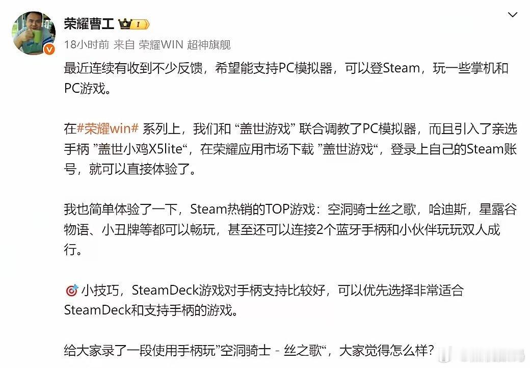 荣耀WIN系列发布已满一个月,官方放出惊喜,这款机型竟然搭载了PC模拟器功能,最主要的是它竟然可以直接登录Steam账号,这个惊喜说实在对我们这些端游游戏党来说,真的太友好了,不说体验方面,单单可以登录 steam 账号已经胜过很多友商了。 荣耀这次的惊喜,确实惊艳到了博主了荣耀。
