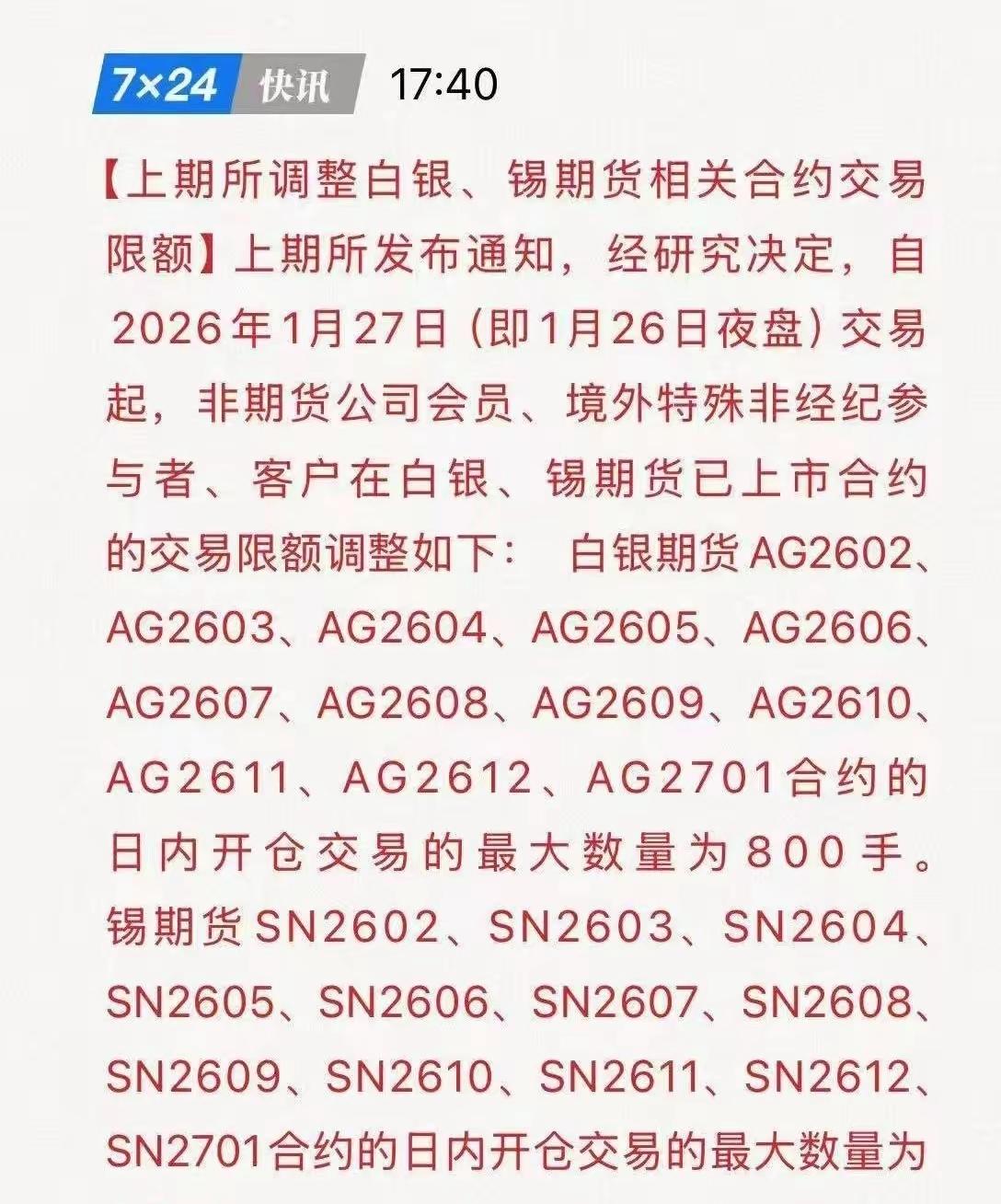1月26号盘后,从今晚夜盘开始,白银和锡开始限购了。交易所,已经使出了,必杀技,势必要把高涨的热情压下去。白银限购800手,锡限购200手。 金属市场情绪高涨,创出历史新高,交易非常活跃。提醒大家保持冷静,警惕当中的风险。 交易所调整保证金、等等一系列“组合拳”,引导市场回归理性。