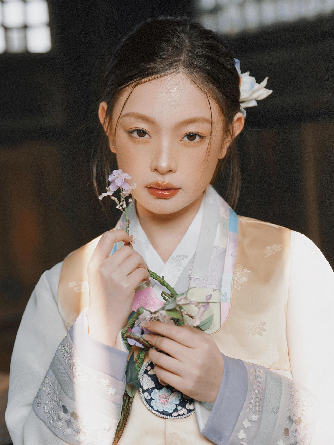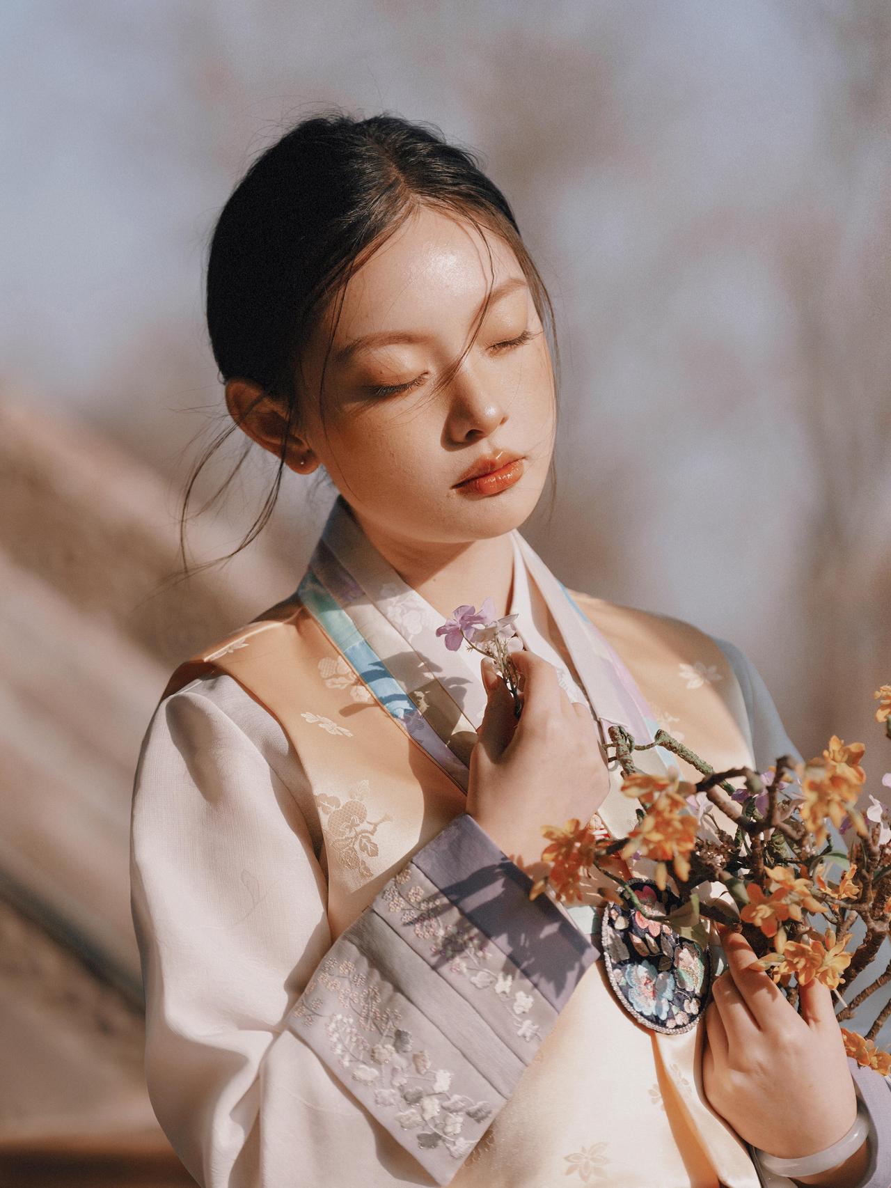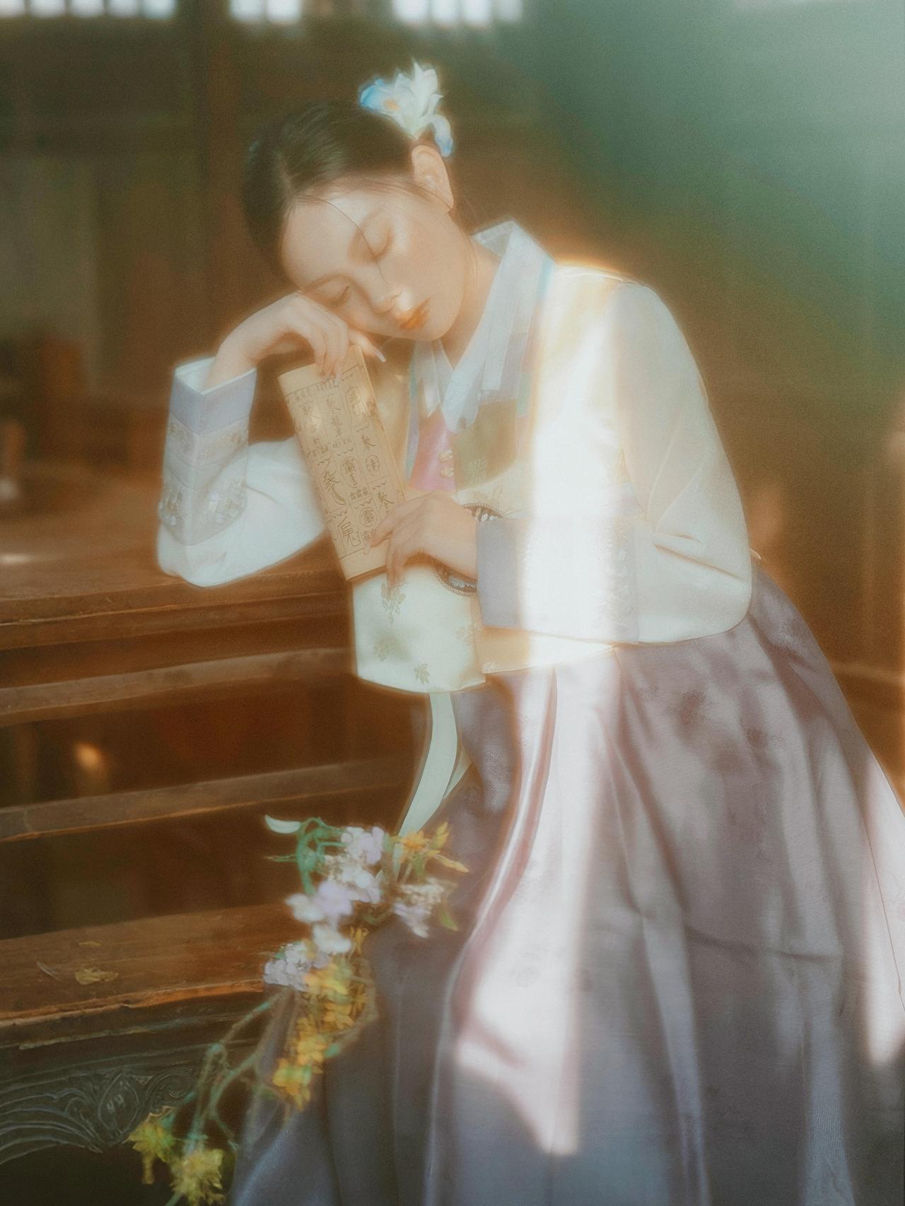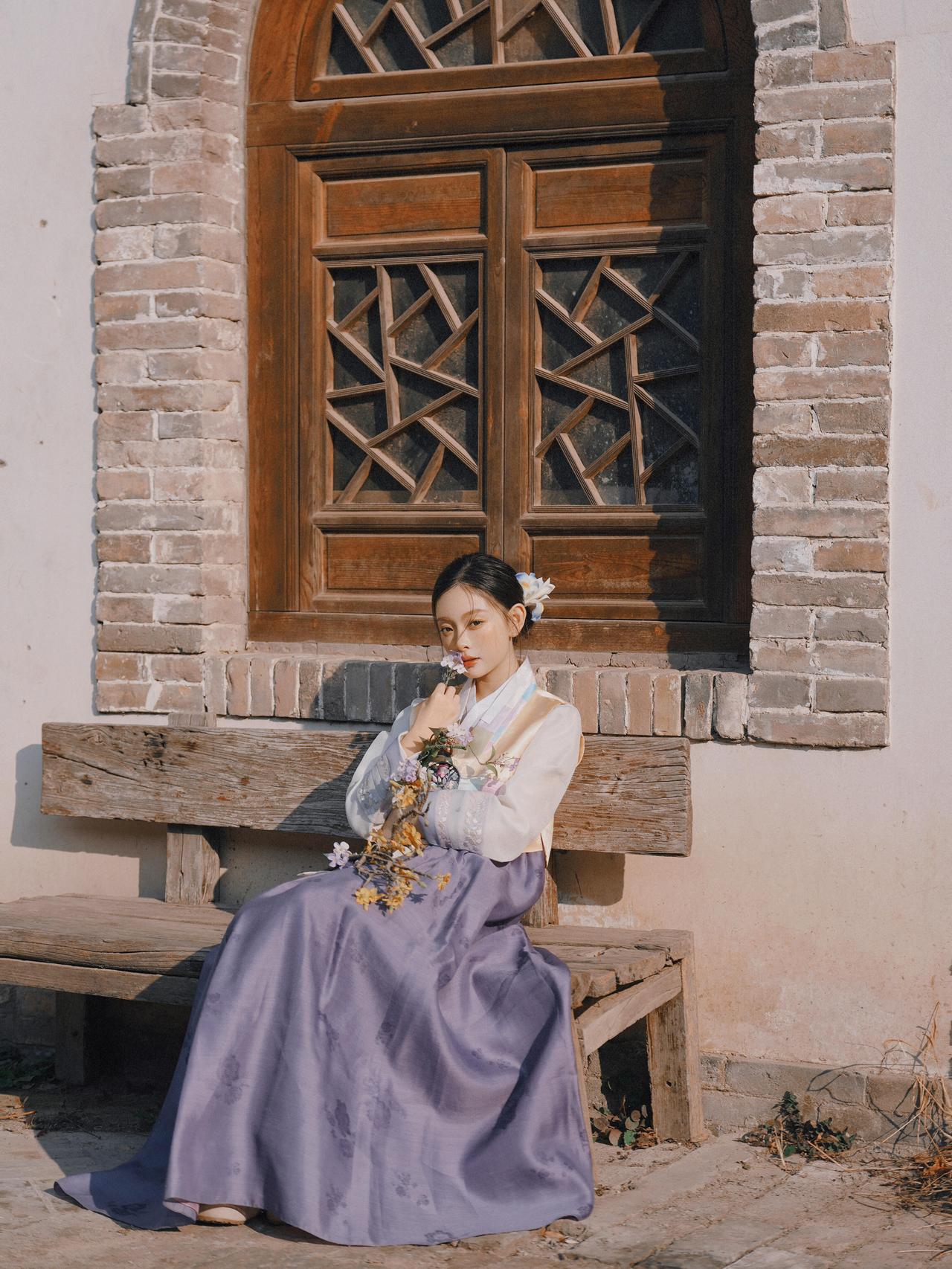 这张坐像以古建木窗为背景,几何窗格纹理与人物服饰的柔美线条形成鲜明对比。暖调侧光在墙面与木椅上投下斑驳光影,营造出温暖而慵懒的午后氛围。 人物手持花枝轻嗅的动作自然细腻,眼神低垂的神态传递出含蓄的东方美感。浅紫长裙的垂坠感与木质长椅的粗糙质感形成触觉对比,增强了画面的层次与质感。 色彩上,暖棕与浅紫的搭配雅致柔和,背景的灰白砖墙起到了很好的衬托作用。画面通过静态构图与细微动作的结合,呈现出一种悠然自得的古典韵味。