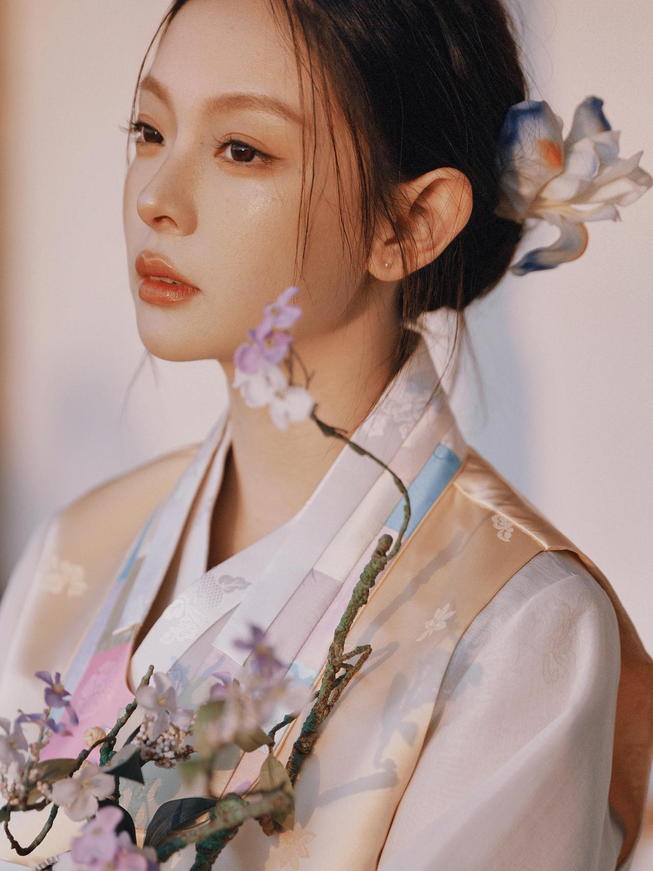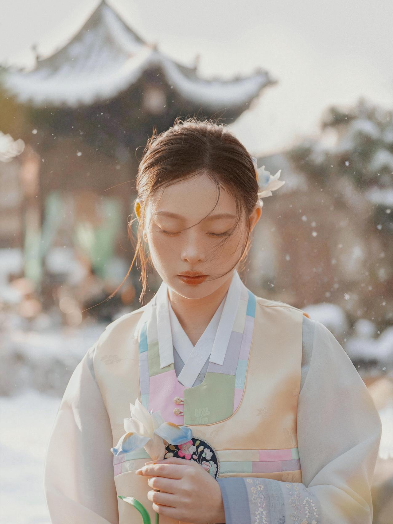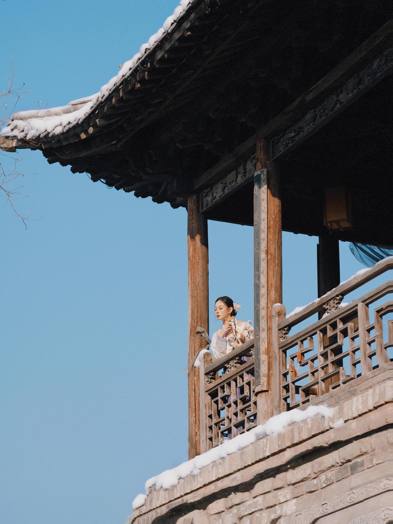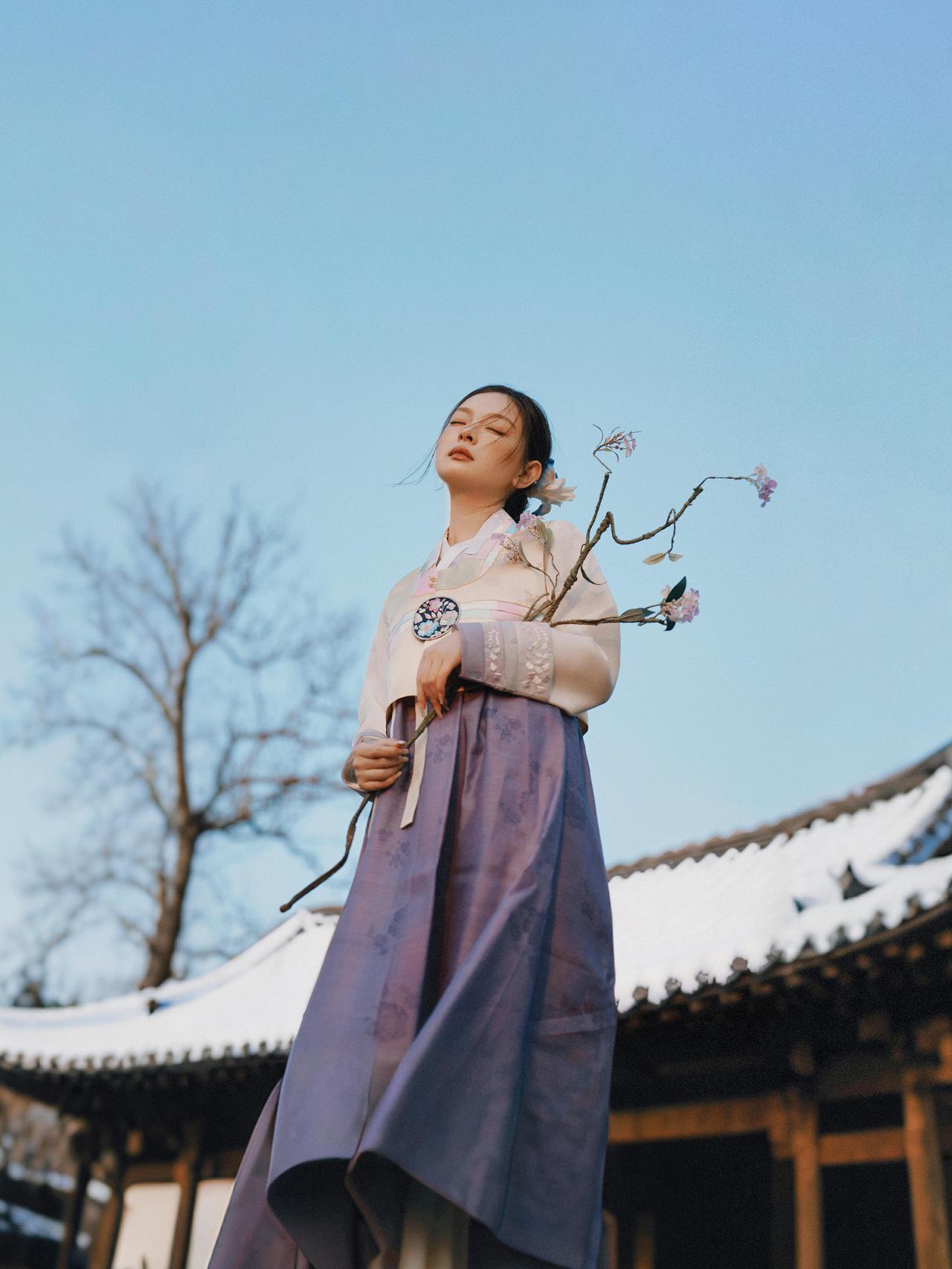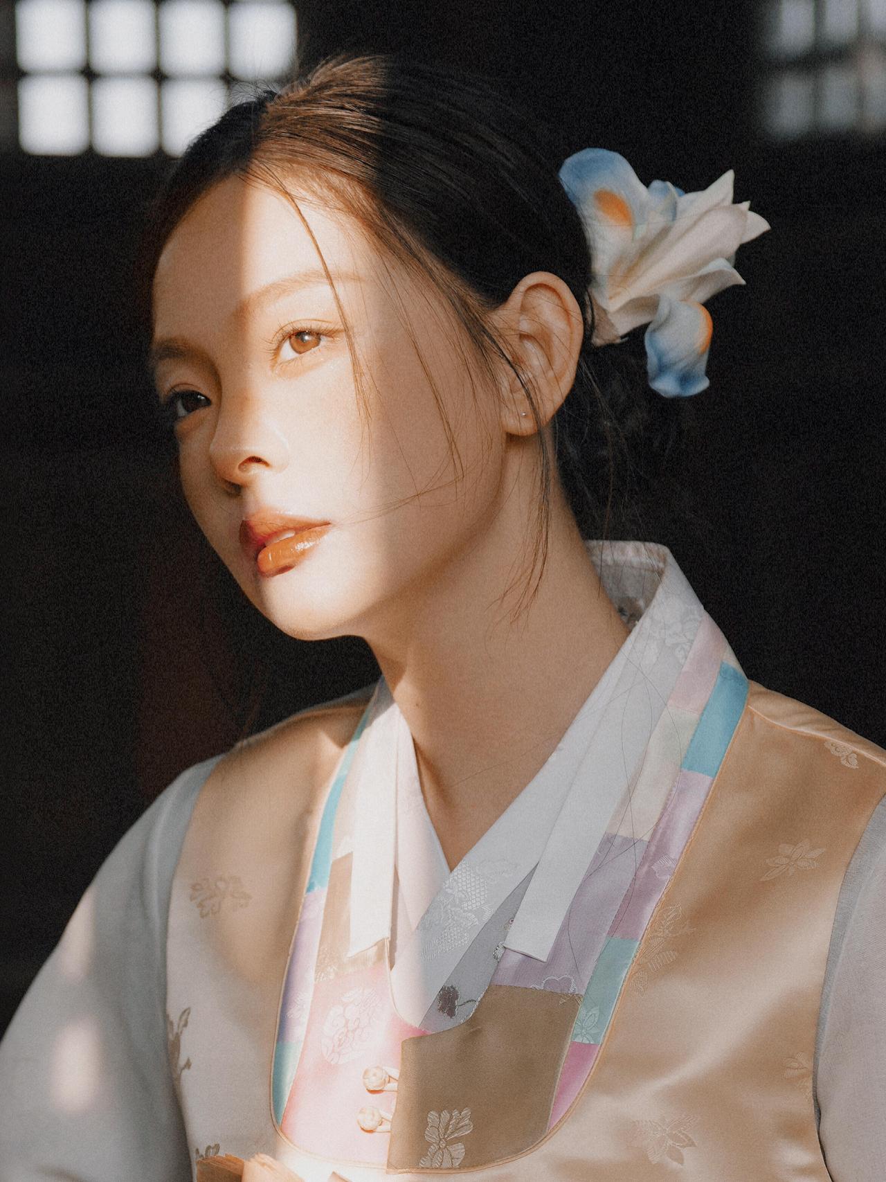 这张坐像以古建木窗为背景,几何窗格纹理与人物服饰的柔美线条形成鲜明对比。暖调侧光在墙面与木椅上投下斑驳光影,营造出温暖而慵懒的午后氛围。 人物手持花枝轻嗅的动作自然细腻,眼神低垂的神态传递出含蓄的东方美感。浅紫长裙的垂坠感与木质长椅的粗糙质感形成触觉对比,增强了画面的层次与质感。 色彩上,暖棕与浅紫的搭配雅致柔和,背景的灰白砖墙起到了很好的衬托作用。画面通过静态构图与细微动作的结合,呈现出一种悠然自得的古典韵味。